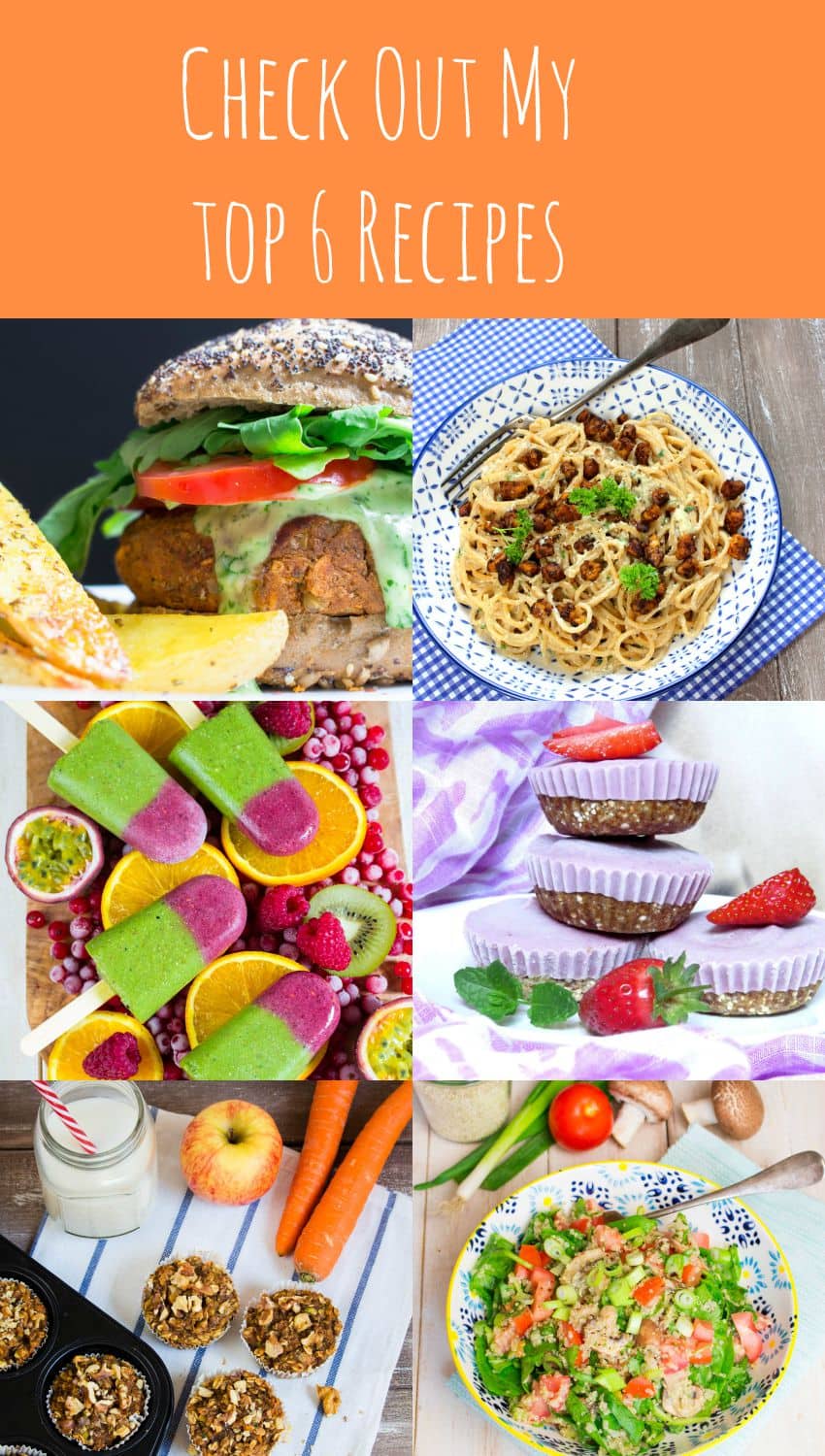 My Top 6 Recipes Pinterest Facebook Vegan Lentil Burger with Basil Mayonnaise Vegan Tempeh Carbonara Tropical Green Smoothie Popsicles Vegan Strawberry Mini Cheesecakes Vegan Carrot Zucchini Muffins Quinoa Salad with Mushrooms and Spinach