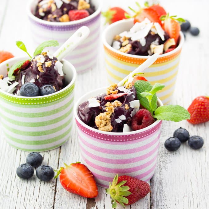 Dear summer, Where are you?! Please come back!! It has been raining almost non-stop for days now and we even had some serious floodings in some parts of Germany. I SO can’t wait for it to stop, so I can finally spend some time outside and go jogging again. But in the meantime I needed to have at least a little bit of summer, so I made some 2 ingredient blueberry ice cream with coconut chips, fresh berries, and granola on top.