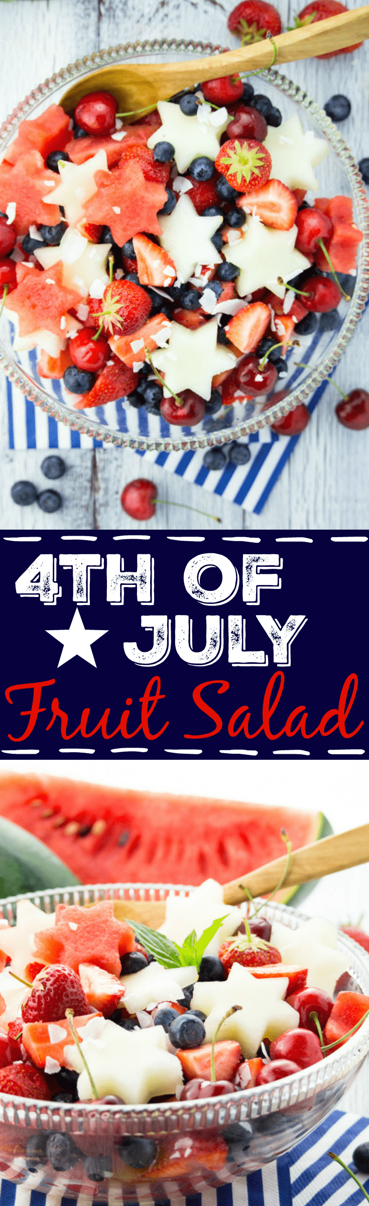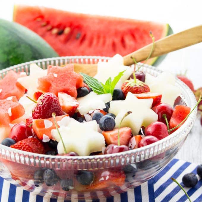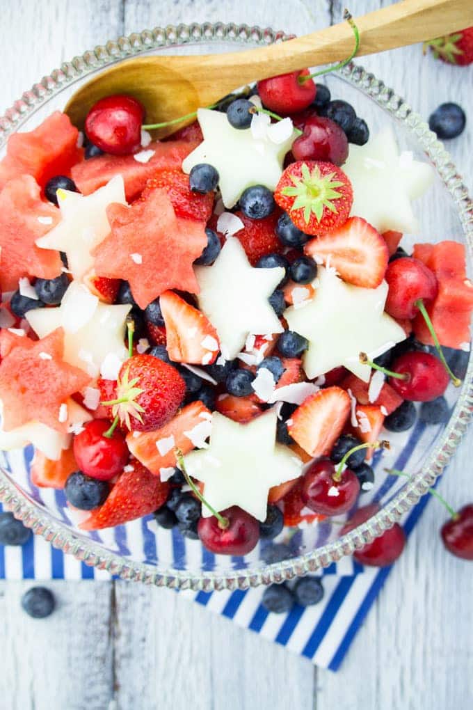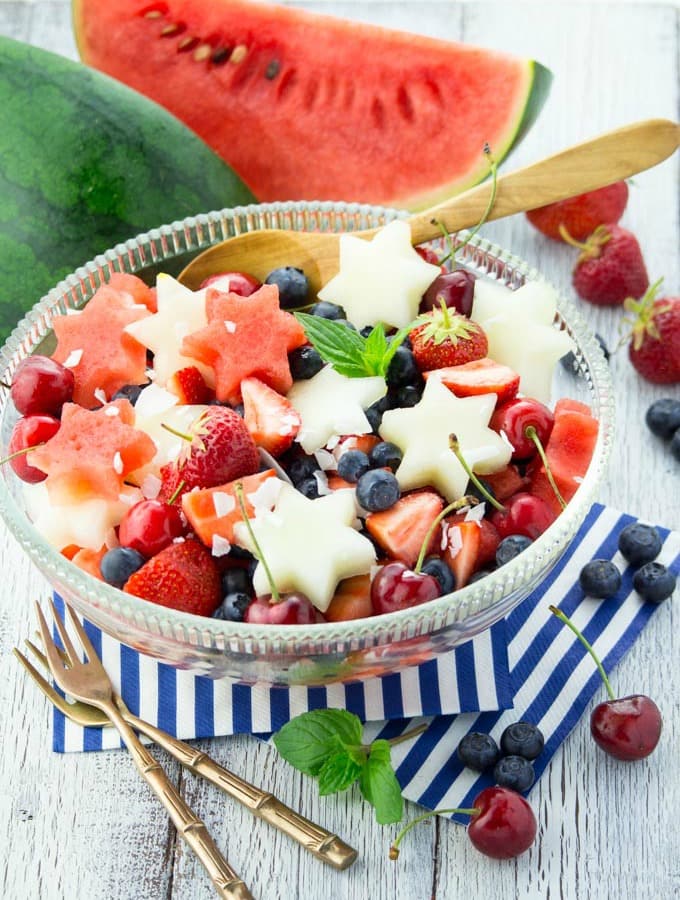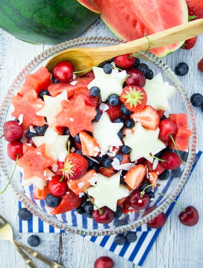 - Combine the melon stars, the strawberries, cherries, and blueberries in a large bowl and sprinkle with coconut flakes. If you want you could also serve this 4th of July fruit salad with some homemade coconut whipped cream.