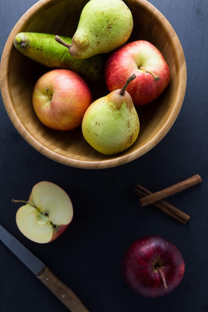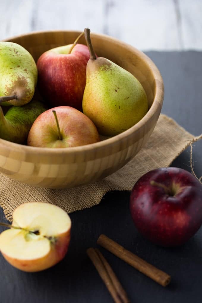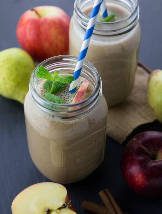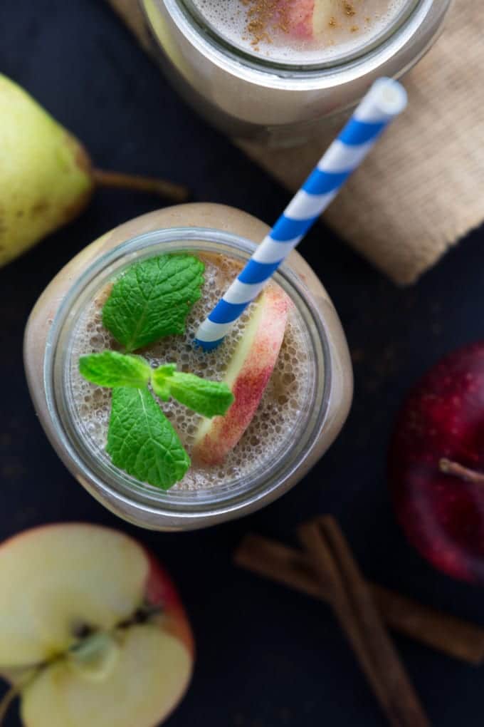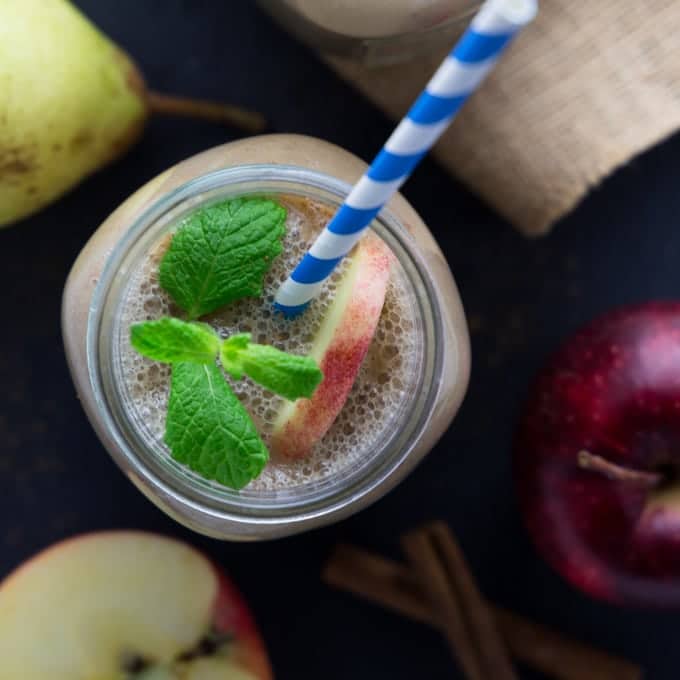 This apple pear smoothie with almond milk and a pinch of cinnamon is perfect for fall and winter! Great for breakfast or as an afternoon snack!