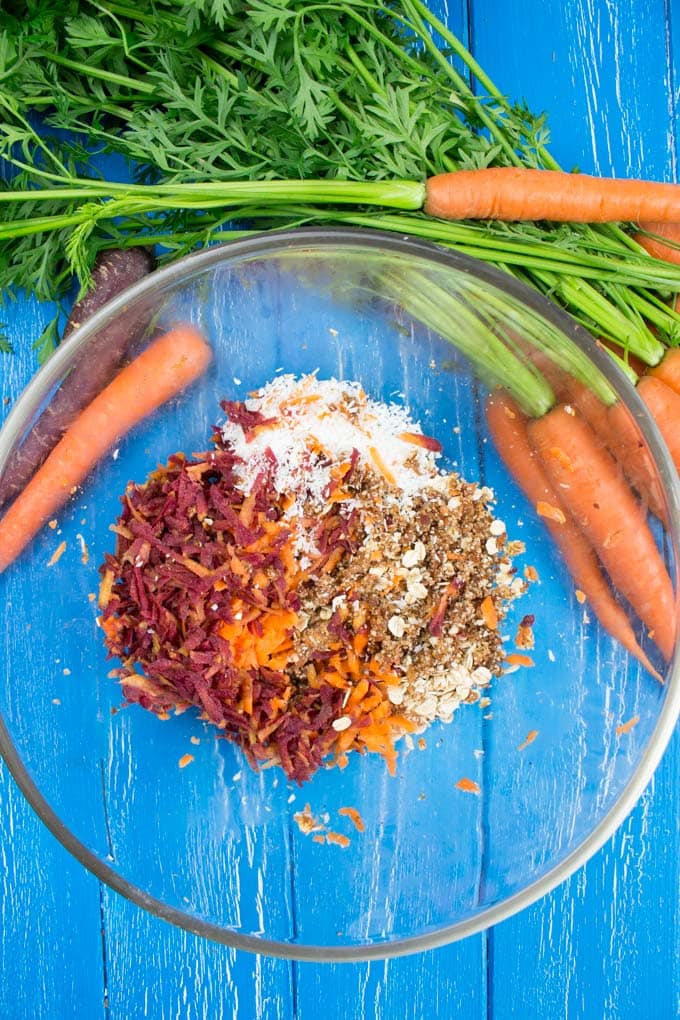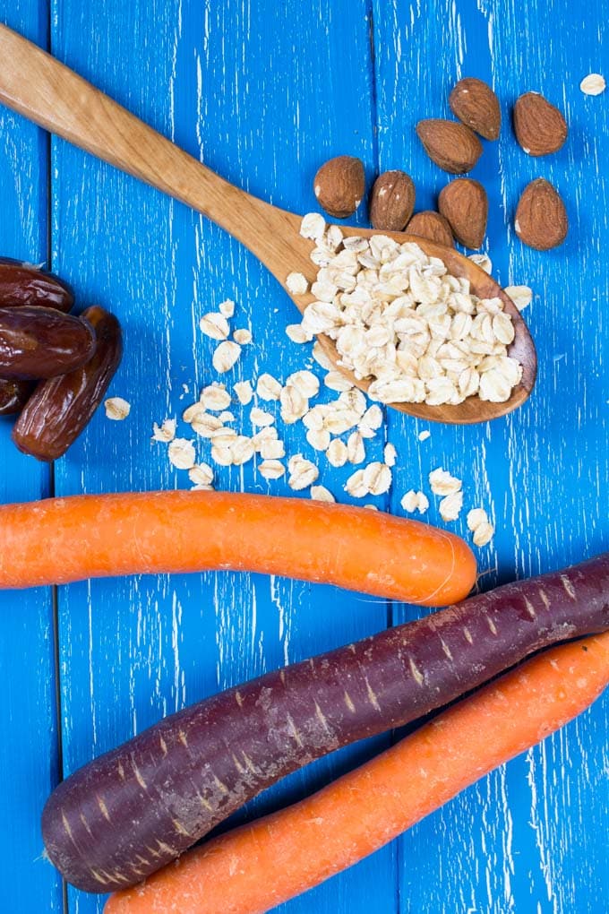 To make these little carrot energy balls, you only need 5 main ingredients: Carrots (I used both orange and purple ones, but of course one color is good enough), almonds, dates, coconut flakes, and rolled oats. I also added one teaspoon of cinnamon and half a teaspoon of vanilla extract.