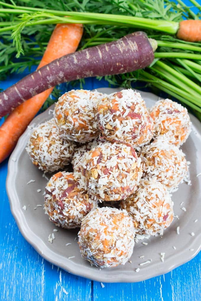 - Then put the almonds together with the dates into a food processor or blender and process until a sticky mixture forms. Add this to the grated carrots, stir in the rolled oats, the coconut flakes, the cinnamon, and the vanilla extract and knead it with your fingers, so it all sticks together. Form about 12-15 energy balls depending on the size you want.