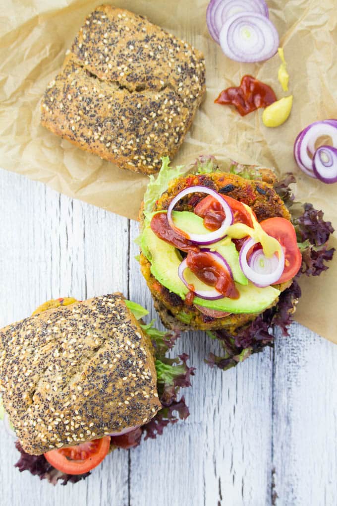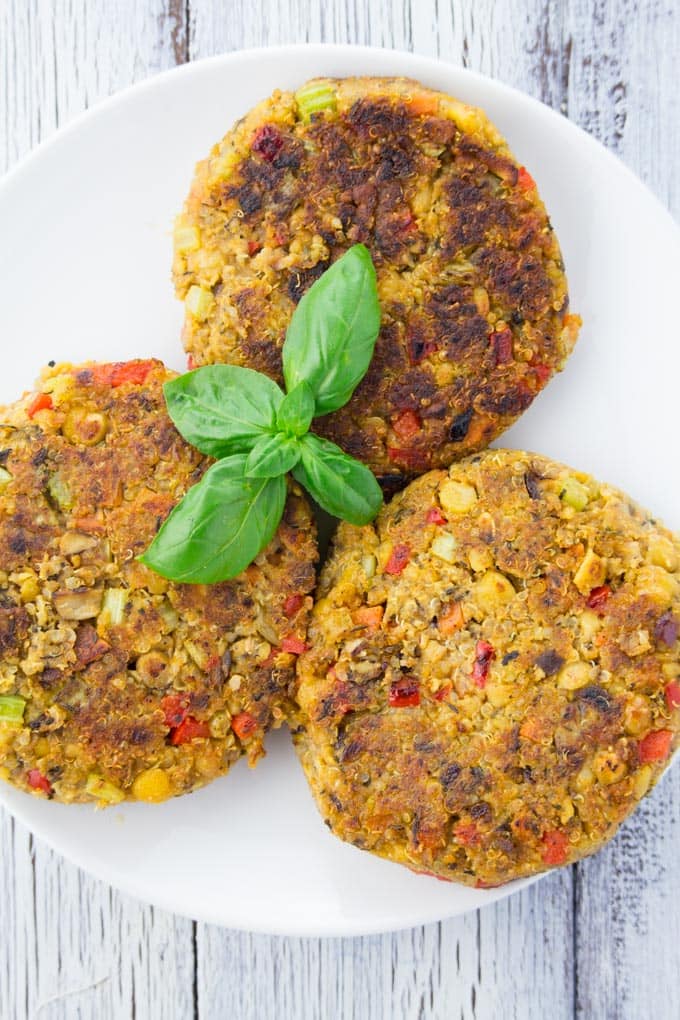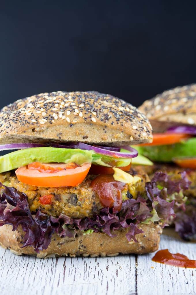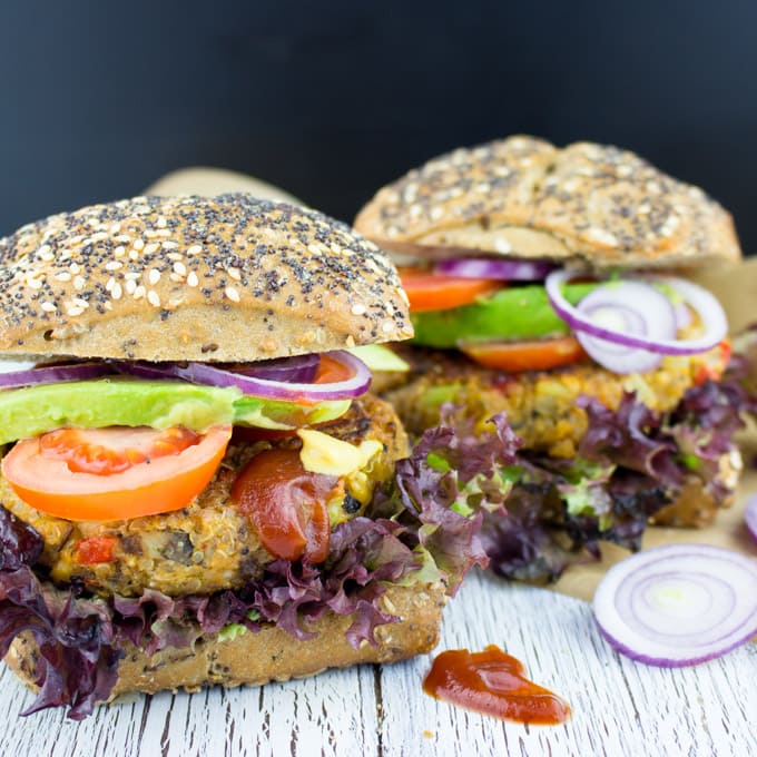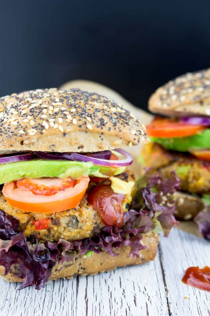It really deserves its name as a “power burger”. Besides quinoa and chickpeas it contains lots of fresh vegetables like mushrooms, red bell pepper, celery, and carrots. I also used garlic, a red onion, lots of spices, mustard, and liquid smoke, which is, however, optional but really gives the veggie burgers a great smoky taste. Quinoa is super healthy and we have it at least once or twice a week. It’s packed with protein, fiber, vitamins, and minerals. It contains 50% more iron than wheat and is also rich in calcium. Besides its protein is high in essential amino acids, so it really is the perfect garnish or even the main part of a meal like in these vegan quinoa burgers.