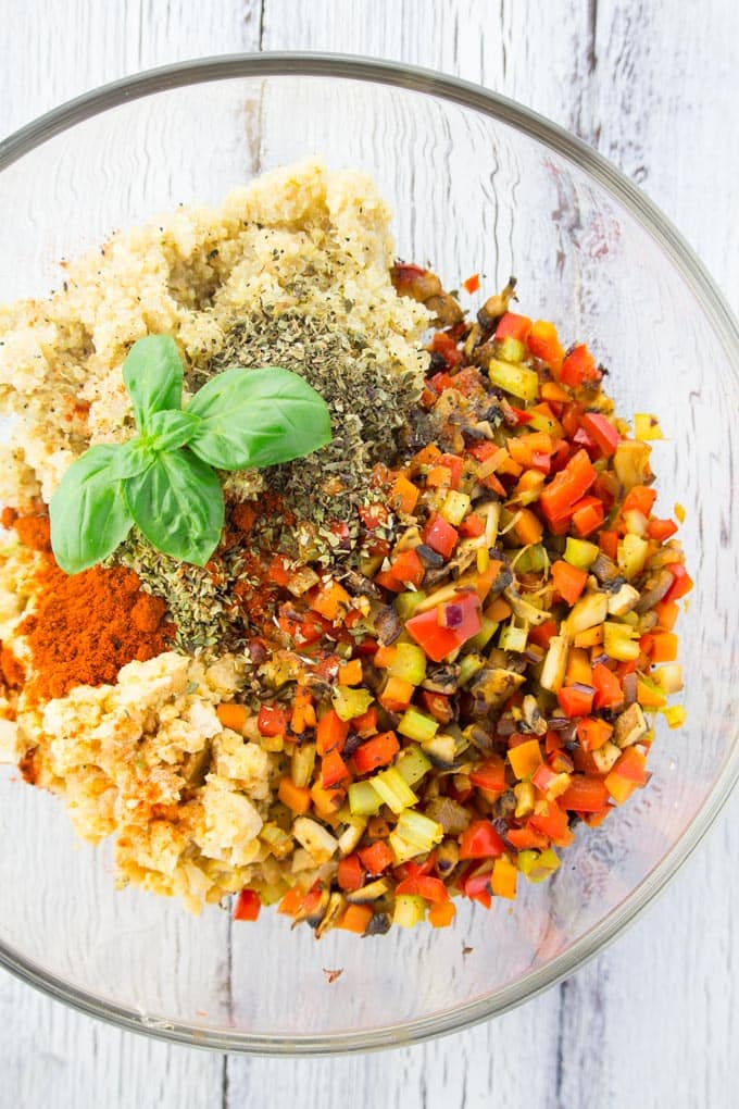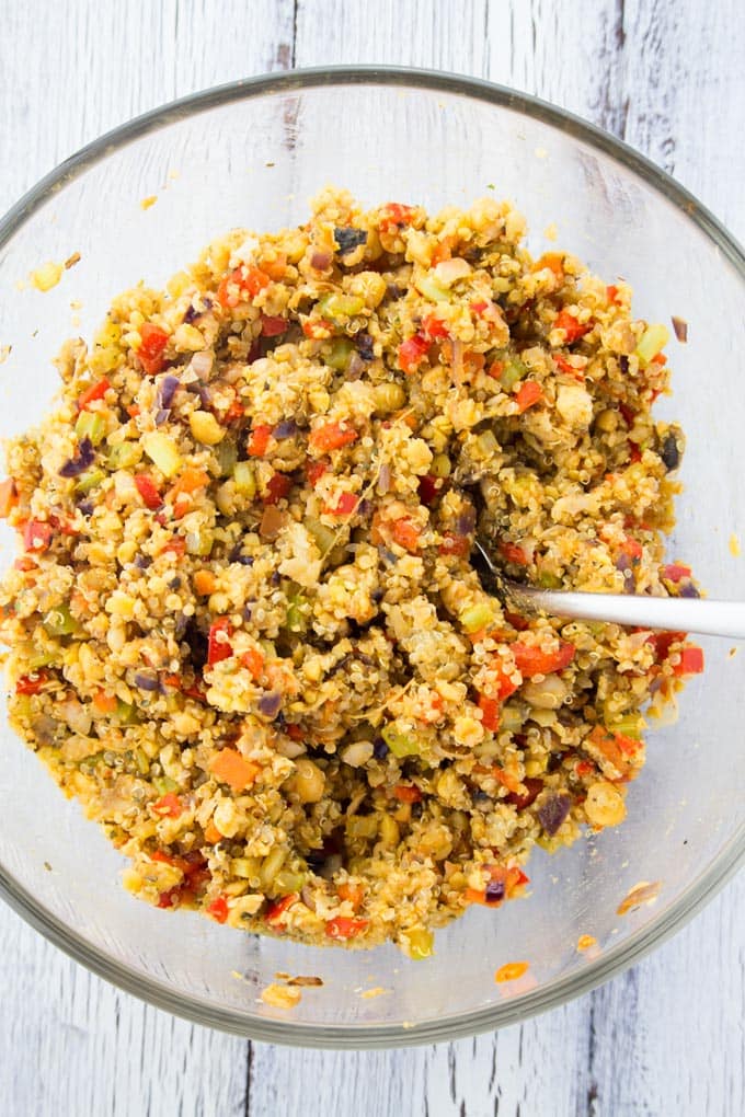 - In a large bowl combine the quinoa, the mashed chickpeas, the flax egg, and the cooked veggies. Add the spices, the mustard, guar gum, salt, pepper, and if using the liquid smoke and red pepper flakes and stir well.