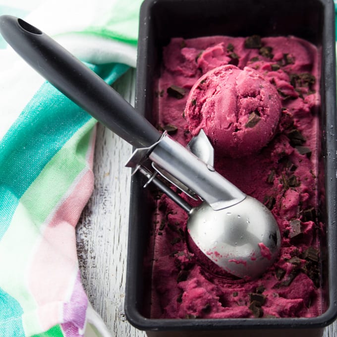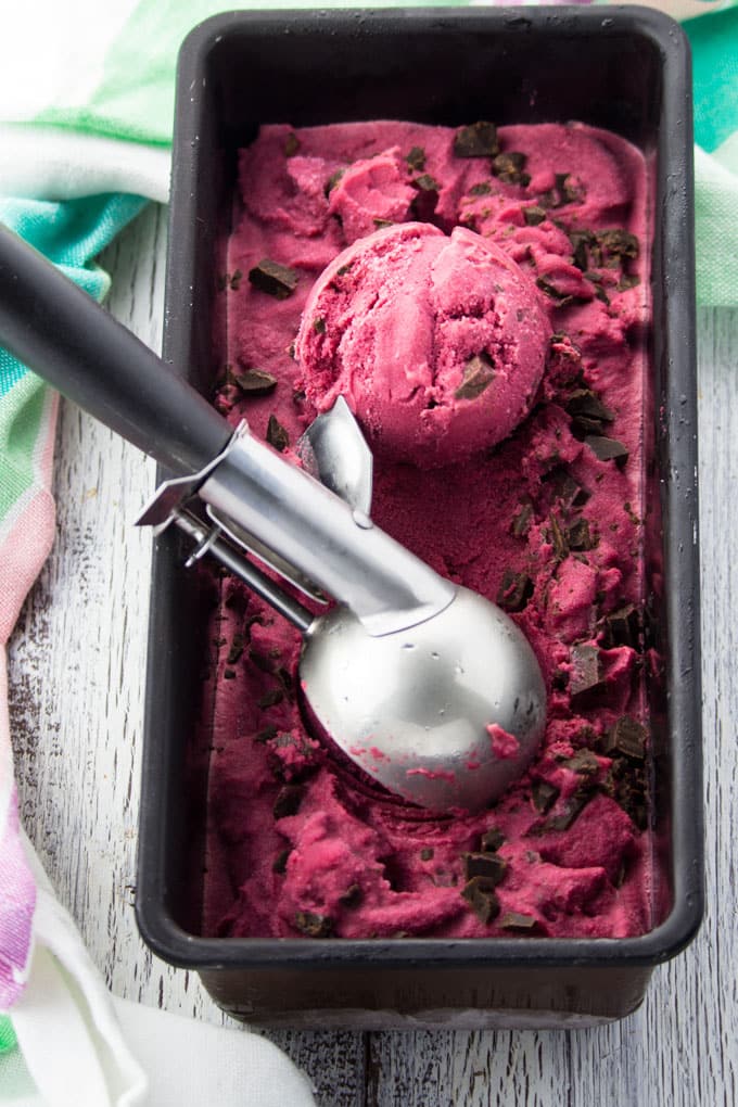 - No Machine/No Churn: Put the beet coconut mixture in a freezer-safe container, stir in the chococalte chunks and freeze for about 4 hours, whisking slightly every 20-30 minutes to avoid it getting too icy. Thaw for 5-10 minutes and scoop with an ice cream scoop.