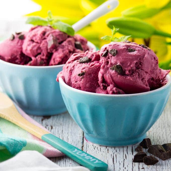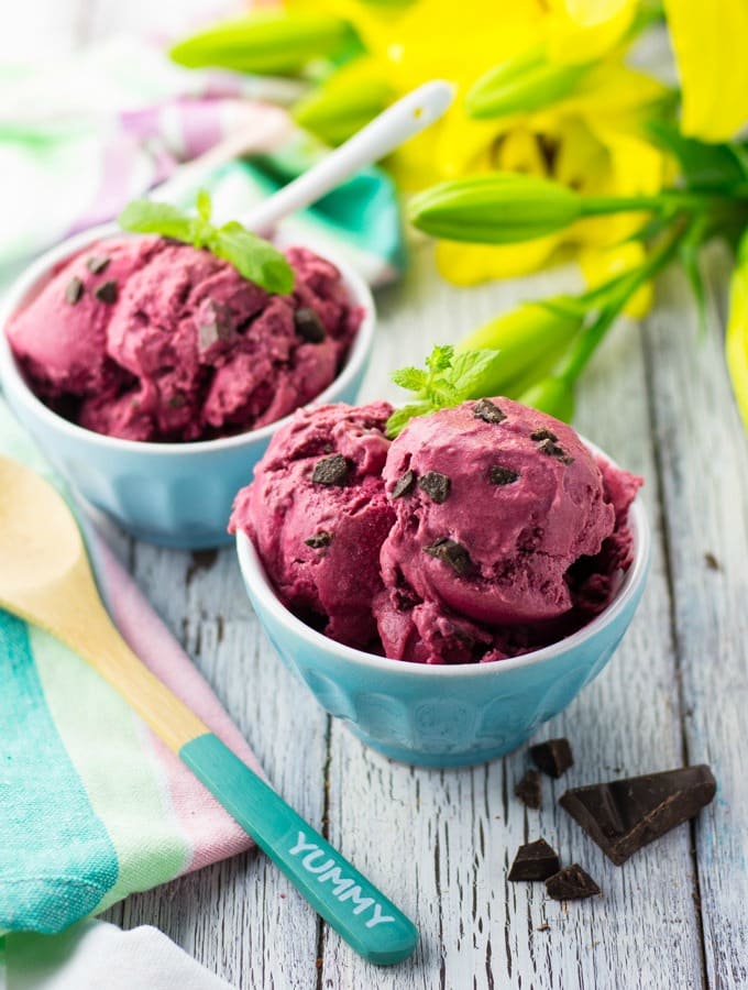 I’m so in love with the color of this purple ice cream! When Flo first saw it, he said it kind of looked like purple unicorn ice cream with some chocolate chunks in it. And I think it really does!! I first thought of giving it this name, but probably nobody would have ever found it using Google. So I decided to just go with beet ice cream instead…
