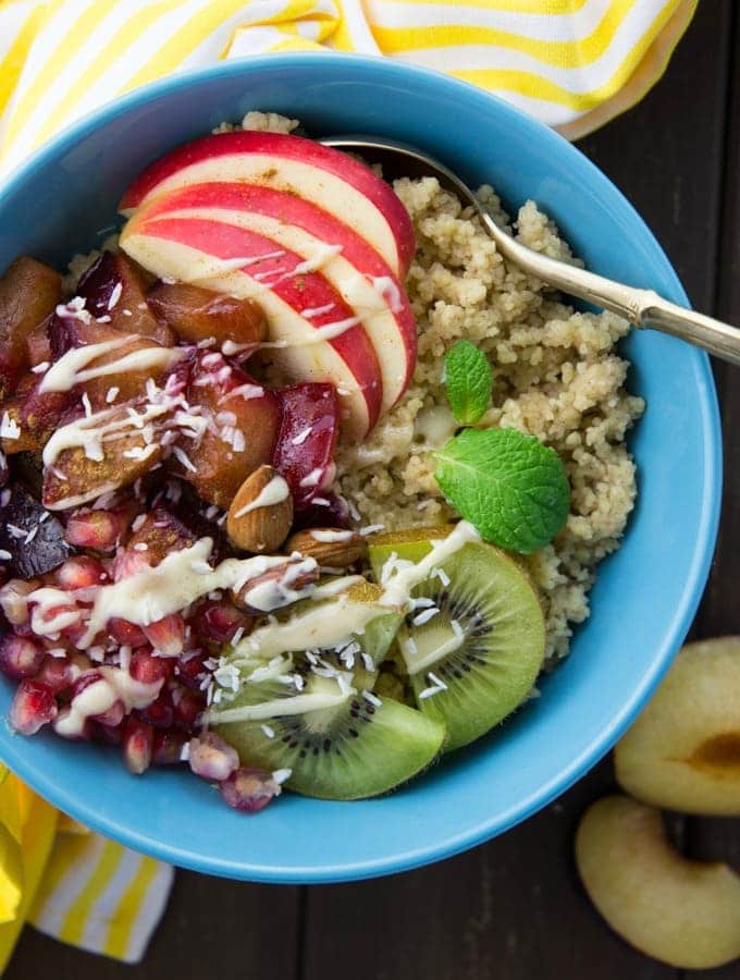 I’ve wanted to try sweet couscous for like ever. But somehow I always chose hearty couscous dishes like couscous salad over sweet couscous. Now I finally made this couscous dessert bowl with cinnamon plums, pomegranate, and almond butter. And it turned out sooo delicious and comforting!!