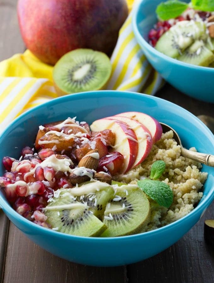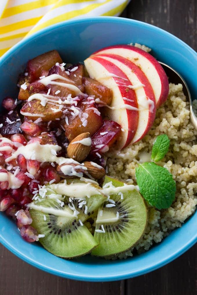 Of course you could also call this couscous dessert bowl a couscous breakfast bowl. And isn’t it just awesome that you can have dessert for breakfast and still eat super healthy?! If you want it to look a bit more fancy, for example for Thanksgiving or Christmas, you could also serve it in dessert glasses and make different layers of couscous and fruits. It’s also super delicious with homemade coconut whipped cream.