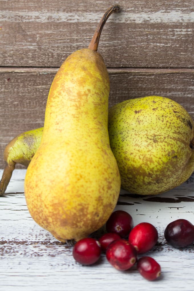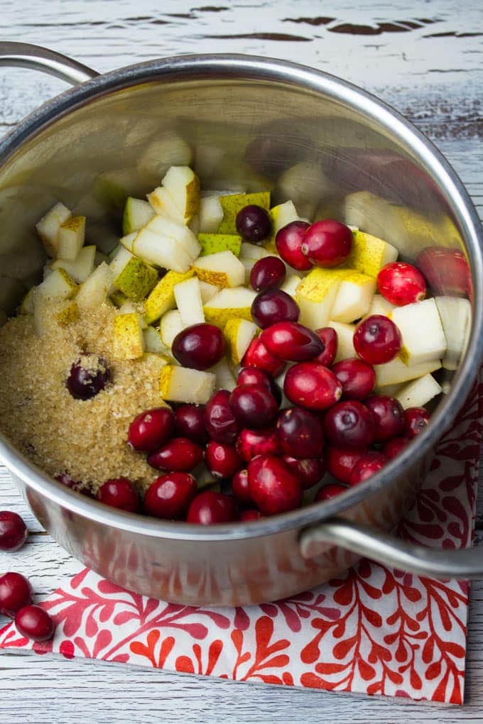 For the cranberry pear dip, cut the pears into medium-sized cubes. Put them into a small sauce pan together with the cranberries.