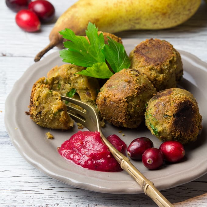 Serve the falafel together with the cranberry pear dip and you got a great and easy vegan appetizer for the holidays. If you got some leftovers, the falafel are also great in a pita with some lettuce, cucumber, tomatoes, and yogurt sauce.