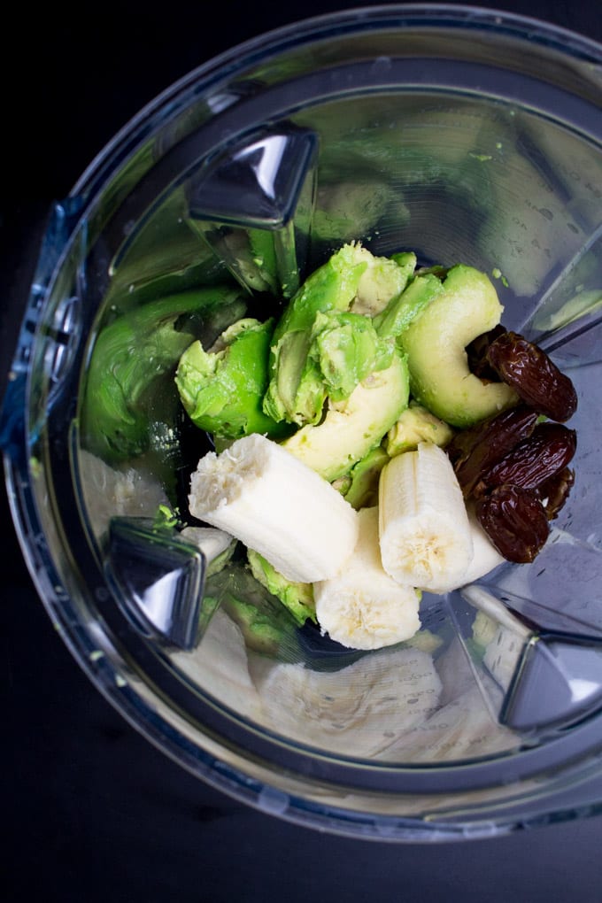 You only need five ingredients: Two ripe avocados, one large banana, cacao powder, almond milk, and gingerbread spice. For those of you who have never heard of gingerbread spice, it usually is a mixture of cinnamon, anise, coriander, cardamom, ginger, cloves, and pepper. You can either order it online on amazon