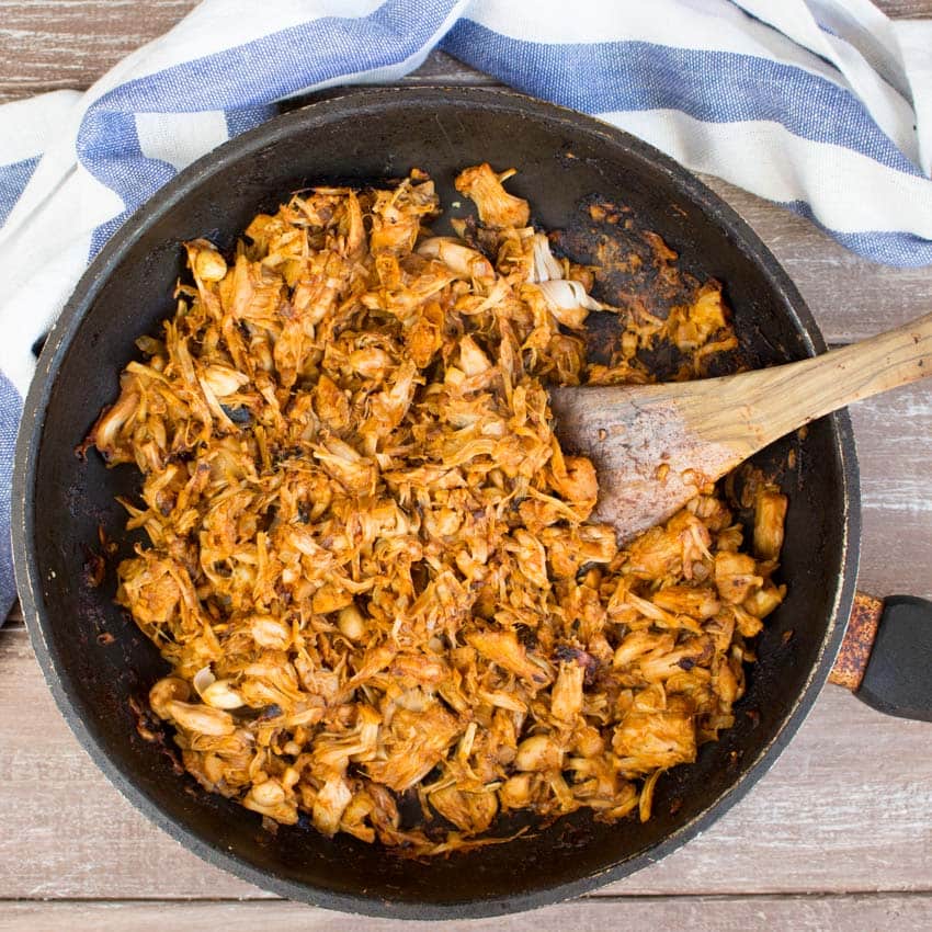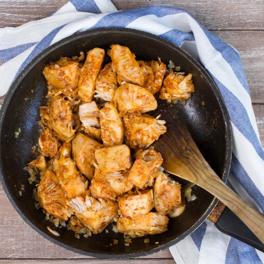 Make sure to use young jackfruit in brine or water, not in syrup. It’s available in Asian supermarkets or on Amazon.