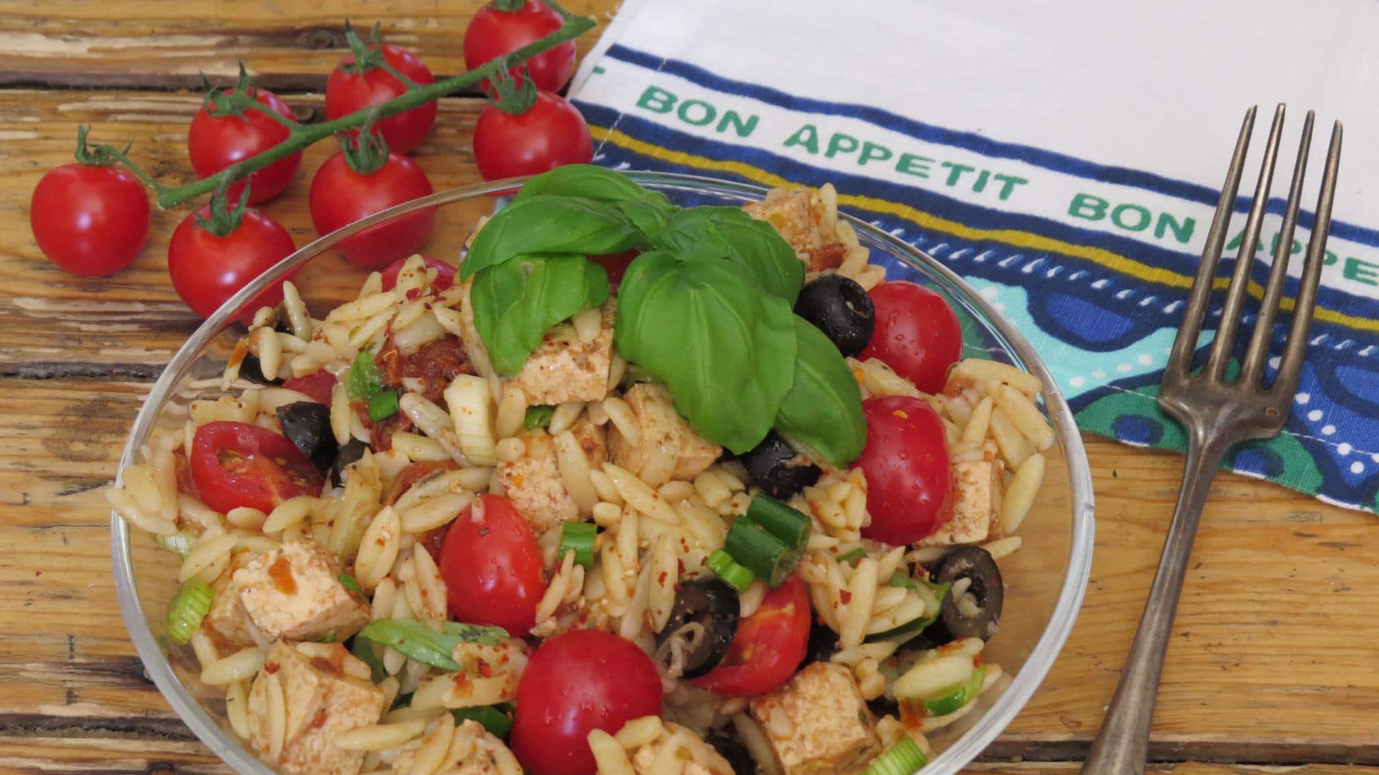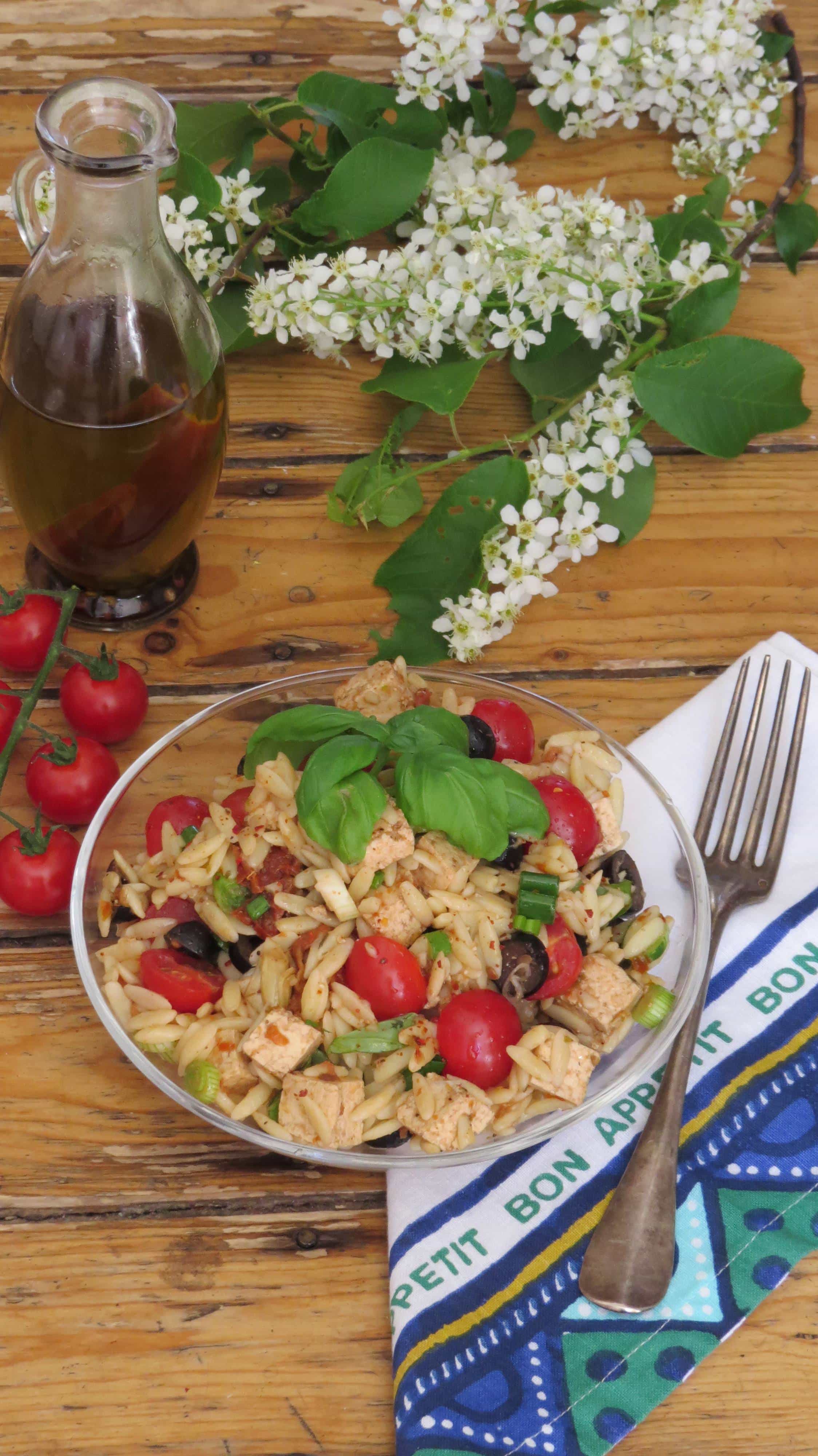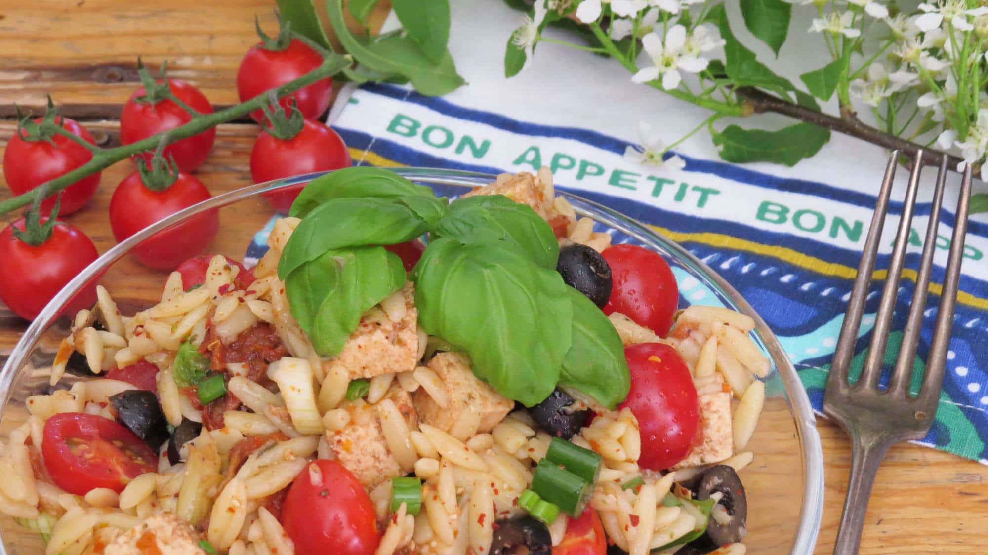 However, I don’t only want to tell you about my trip to London in this article, but I also have a new recipe for you! Some time ago, I bought a package of orzo at the grocery store, but it actually sat in my cupboard for quite a while as I wasn’t exactly sure what to do with it. I already had orzo salad several times, but it was always store-bought, so I decided to use the orzo I bought for a home-made Mediterranean orzo salad with tomatoes, artichokes, olives, and lots of basil. I also added some tofu, which I marinated with a mixture of olive oil, balsamic vinegar, and oregano. It’s important to let it sit for at least an hour, so the tofu soaks up the flavor. If you have a choice, also make sure to buy extra firm tofu.