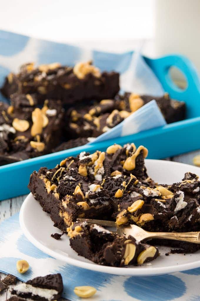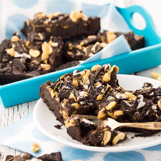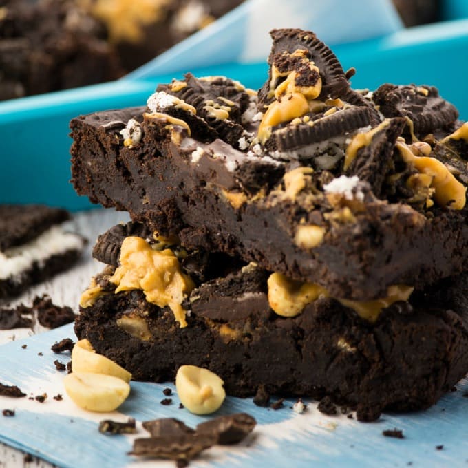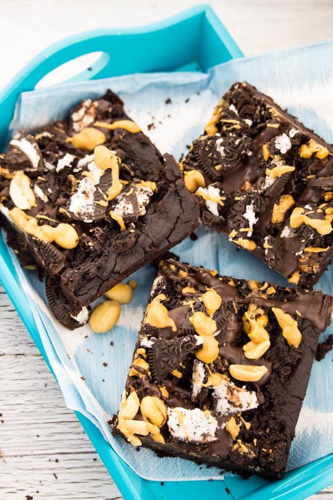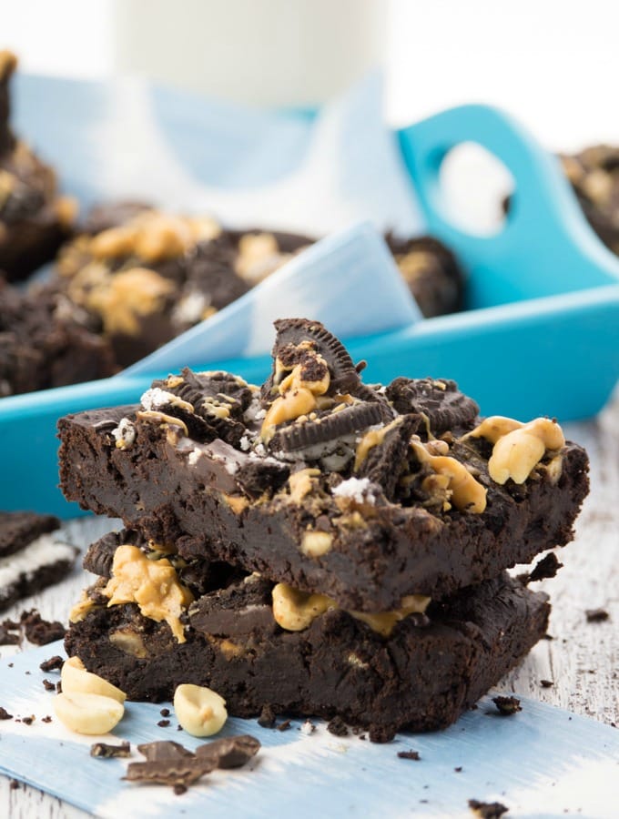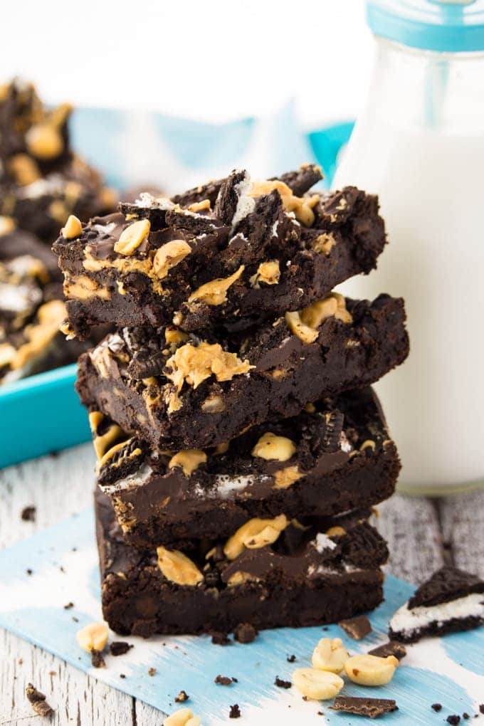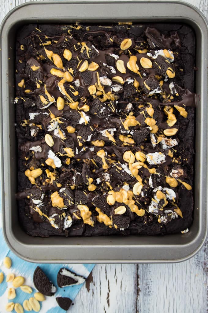 So if you want these Oreo peanut butter brownies to be completely gluten-free and healthier, just leave out the Oreos and only top them with peanut butter, chocolate, and some peanuts.