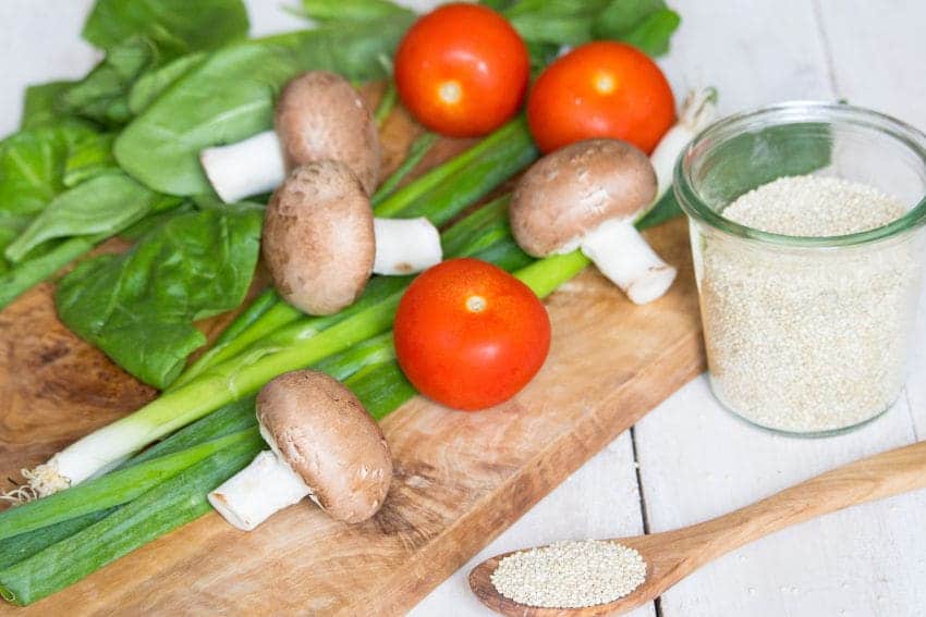 - Stir in the mushrooms, the green onions, the tomatoes, the cooked quinoa, and the spinach. Sprinkle with the remaining green onion.