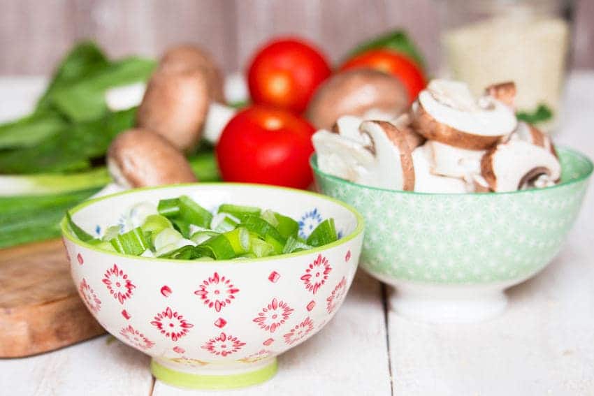 - Meanwhile heat the olive oil in a medium pan and sauté two of the three green onions together with the mushrooms for about three minutes. Set the remaining green onion aside.