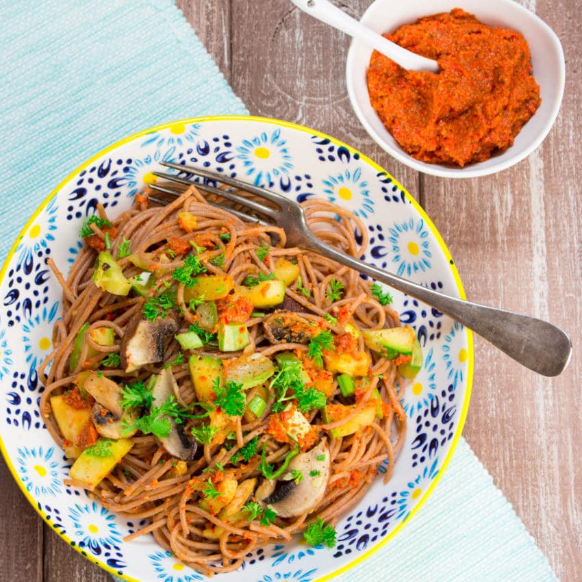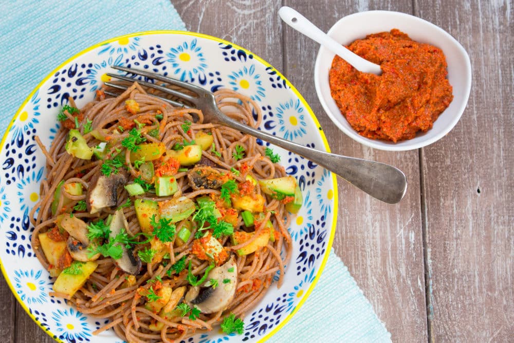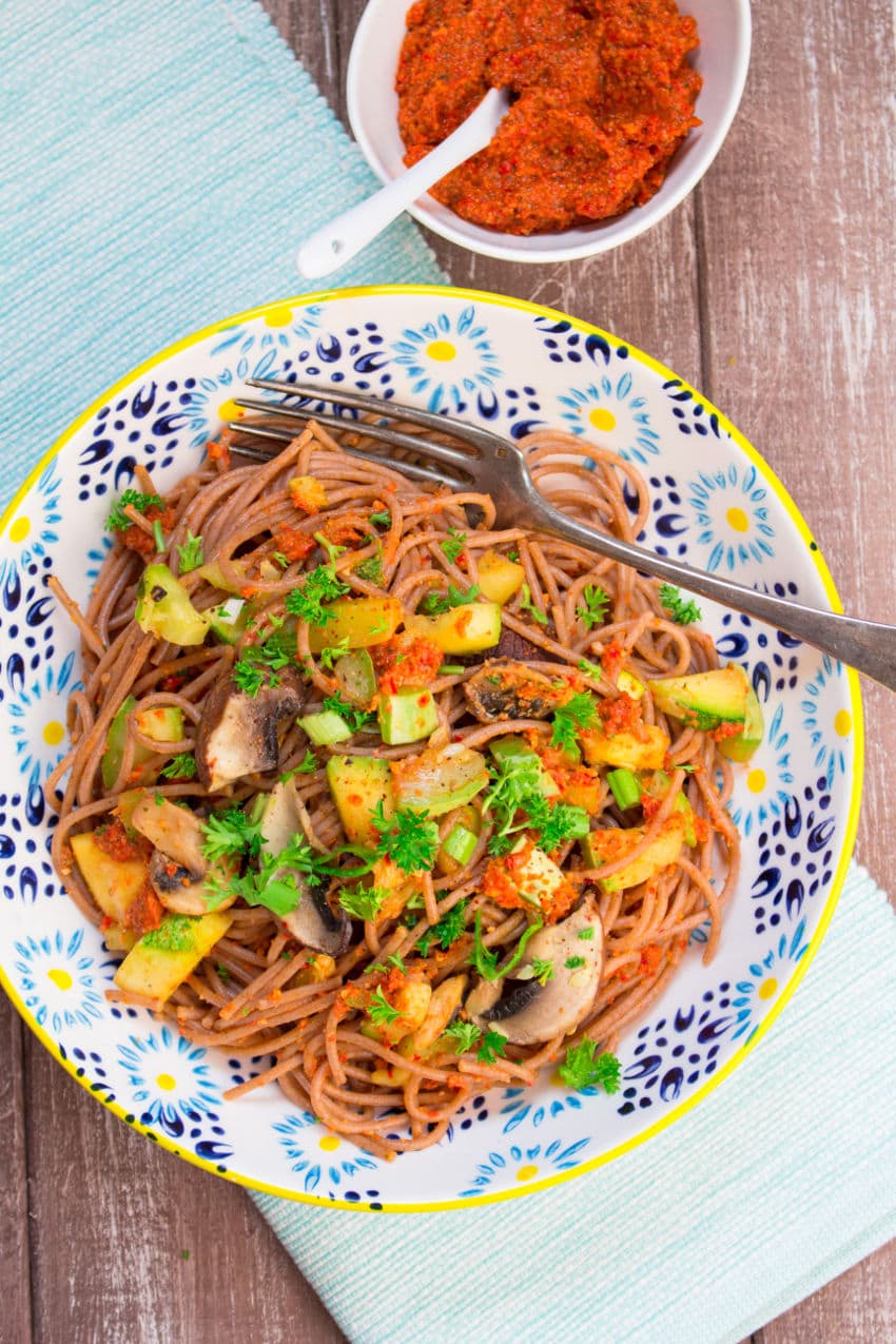 I really love pesto; it’s easy, delicious, and there are so many different variations. We usually stick with green pesto with basil, spinach, or kale (especially in the winter). A couple of days ago, we, however, tried a new recipe: Red bell pepper almond pesto with spelt spaghetti, mushrooms, zucchini, and green onions.