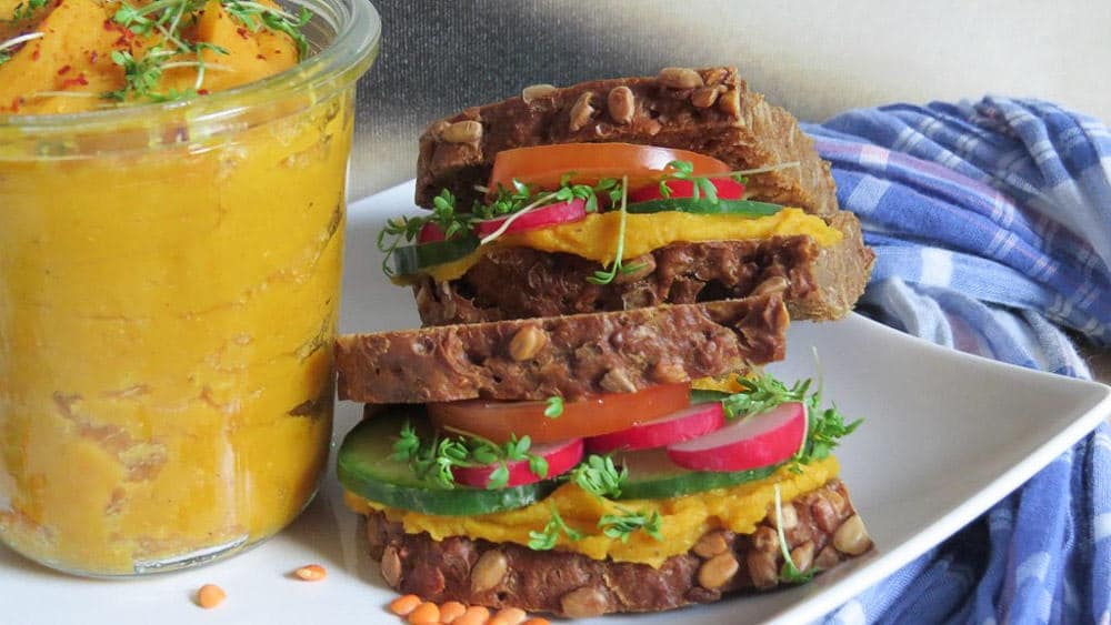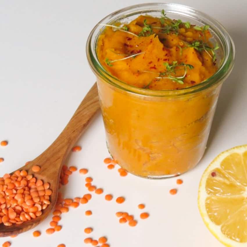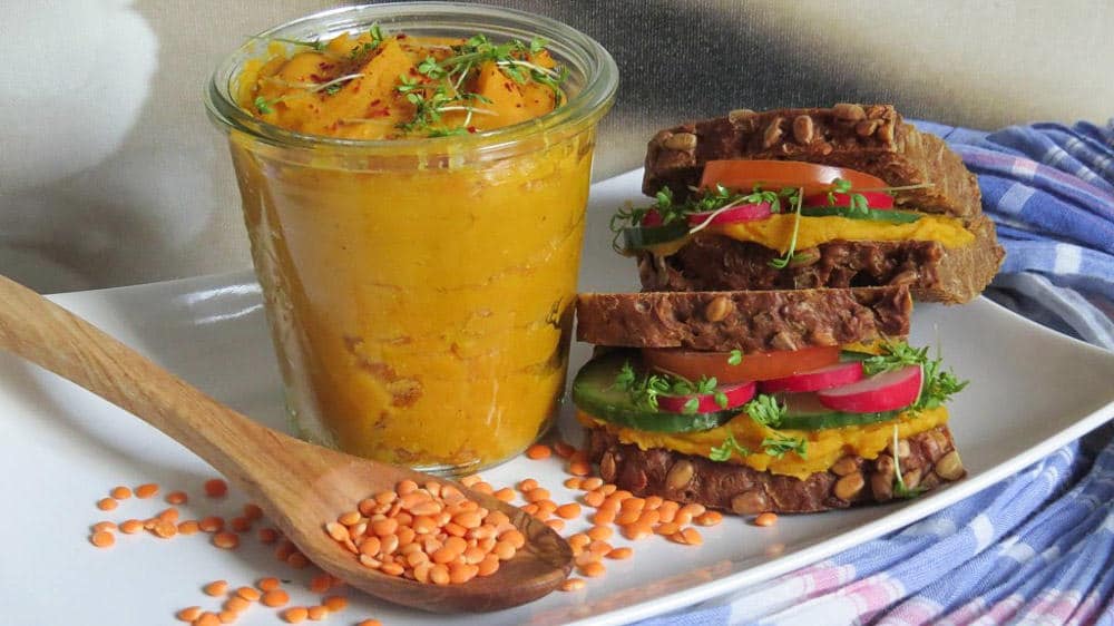 The recipe actually couldn’t be easier. Just cook the red lentils and the sweet potato in the same pot until they’re soft, then put them in a food processor with garlic, lemon juice, and some spices (I used curry, cumin, cilantro, and turmeric) and you got a delicious and healthy spread. If you like you can also add a pinch of red pepper flakes. The red lentil and sweet potato spread can be stored in the fridge for several days. Just make sure you put it in an airtight container. I also like eating it as a dip with fresh veggies.