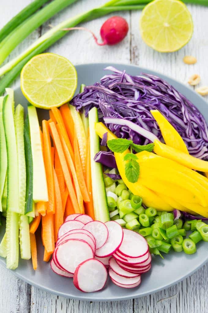 FIRST STEP: Start by cutting up your veggies into thin strips. I used a cucumber, carrots, a mango, radishes, purple cabbage, lettuce, green onions, and mint. I also put in some glass noodles, which are really easy to prepare. Just let them soften in hot water for a couple of minutes.