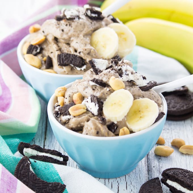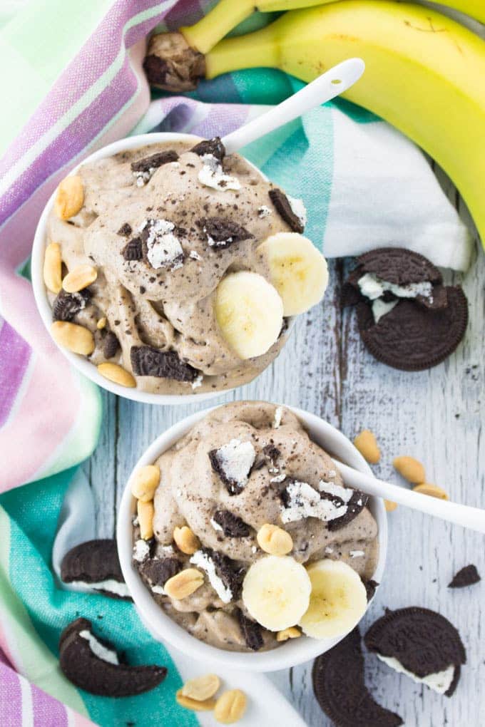 - Fill the nice cream into two cups and top if off with the remaining two oreos (crumbled), the peanuts, and some banana slices. Enjoy!