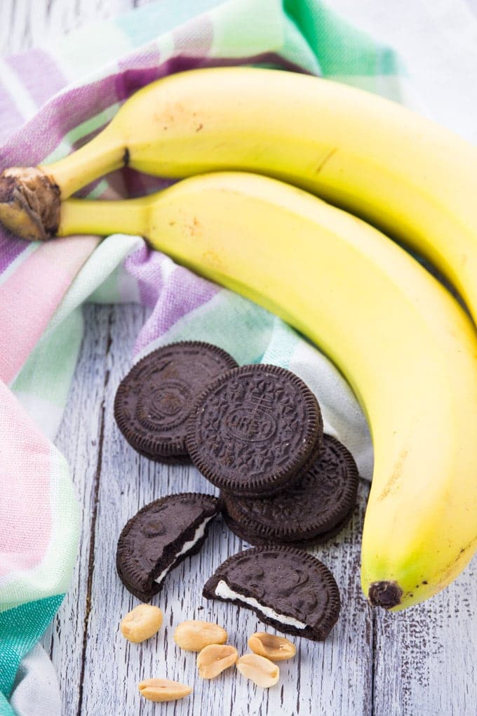- Put the frozen bananas, the chunky peanut butter, and three of the oreo cookies in a blender and process until smooth. If needed add a little almond or other plant-based milk to make it easier for the blender.