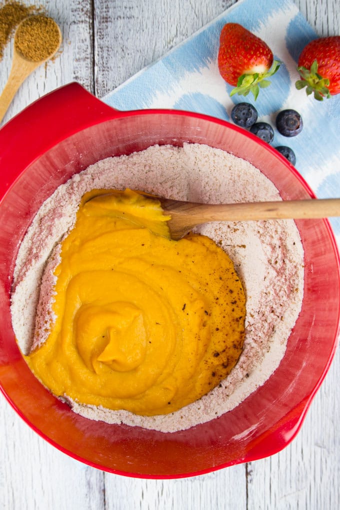 - In a medium bowl, combine the flour, the sugar, the baking powder, the vanilla, the cinnamon, and the salt and add the sweet potato mixture. Stir with a wooden spoon until combined.
