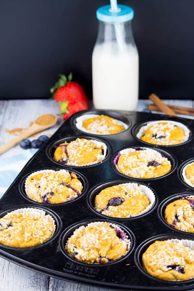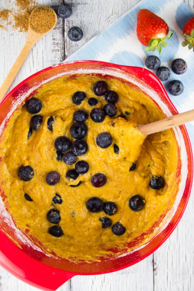- Add the blueberries and use a spatula or spoon to gently fold the blueberries into the sweet potato muffin batter. Bake at 350 °F for about 25-30 minutes depending on your oven.