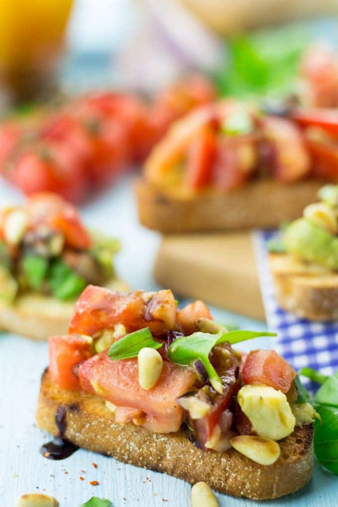 Is there a better way to embrace summer than by eating bruschetta?! These tomato and avocado bruschetta with balsamic reduction and pine nuts are my absolute favorite!! This classic Italian appetizer is a perfect way to enjoy the delicious flavors of summer. Garden-ripened tomatoes, garlic, lots of fresh basil, and a splash of olive oil on a toasted rustic bread – yummy, this really is summer at its best!!