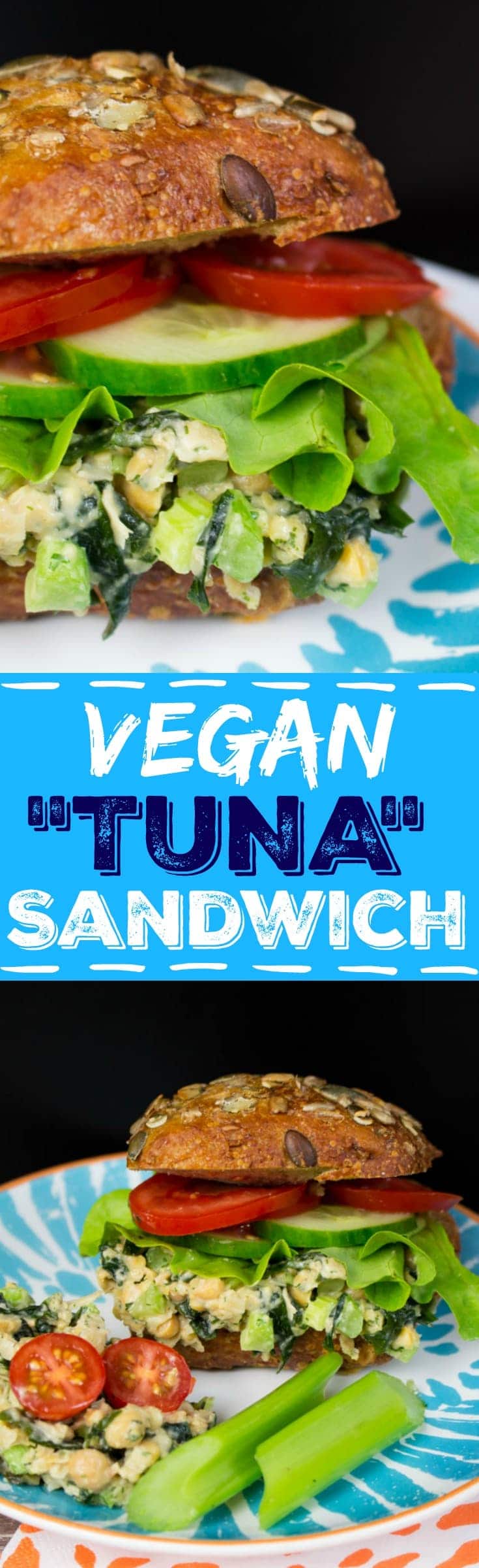 The main ingredient of this vegan tuna salad are chickpeas. You first gotta mash them with a fork until they have a flaky texture. Then add some homemade vegan mayonnaise, finely chopped celery, fresh dill, and soaked seaweed. The seaweed is very important in this recipe as it gives it its “fishy” flavor. As already mentioned, I used shredded dried seaweed, which I soaked in water for a couple of minutes, but I think kelp granules might be even better! The vegan tuna salad is great on its own, but also on a sandwich paired with lettuce, tomato, and cucumber!
