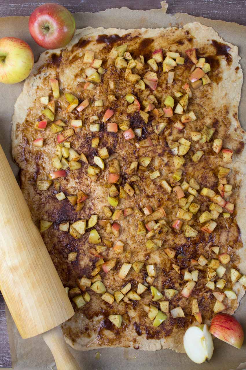 - Let the dough rise for about half an hour. Then make the filling: Cut the apples into small pieces. In a small pan, heat one teaspoon vegan margarine. Cook the apple for about 3 minutes and sprinkle with 1/2 teaspoon cinnamon. Set aside. Then melt the remaining margarine (1 tablespoon).