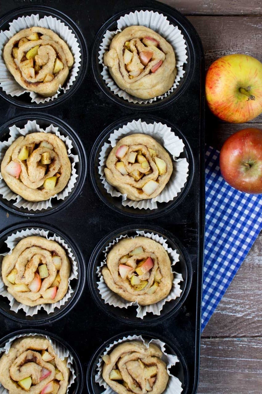 Roll the dough into a rectangle (about 12 by 6 inch) and spread the melted margarine. Then sprinkle with sugar, cinnamon, and equally spread the apples. Roll up the cinnamon rolls and seal the edges. I decided to make mini vegan cinnamon rolls. So I just put them into muffin cups. If you want to do this, make sure to cut them up into exactly 12 pieces. But of course you can also use any other baking form.