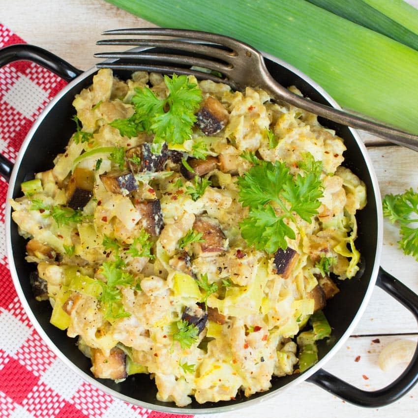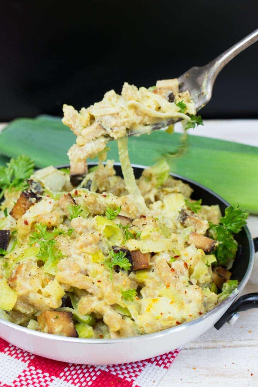 - In a large pan heat the cashew cheese sauce, add the leek, the tofu and gently stir in the spaetzle. Season with salt and pepper and sprinkle with fresh parsley.