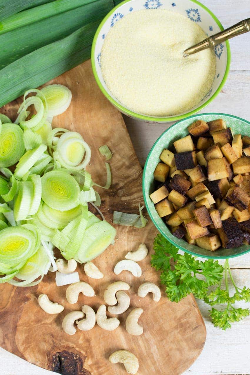 - In a medium pan, heat one tablespoon of olive oil and stir-fry the tofu cubes until they're crispy and lightly golden. Set aside and cook the leak together with one tablespoon of water for about 5 minutes in the same pan.