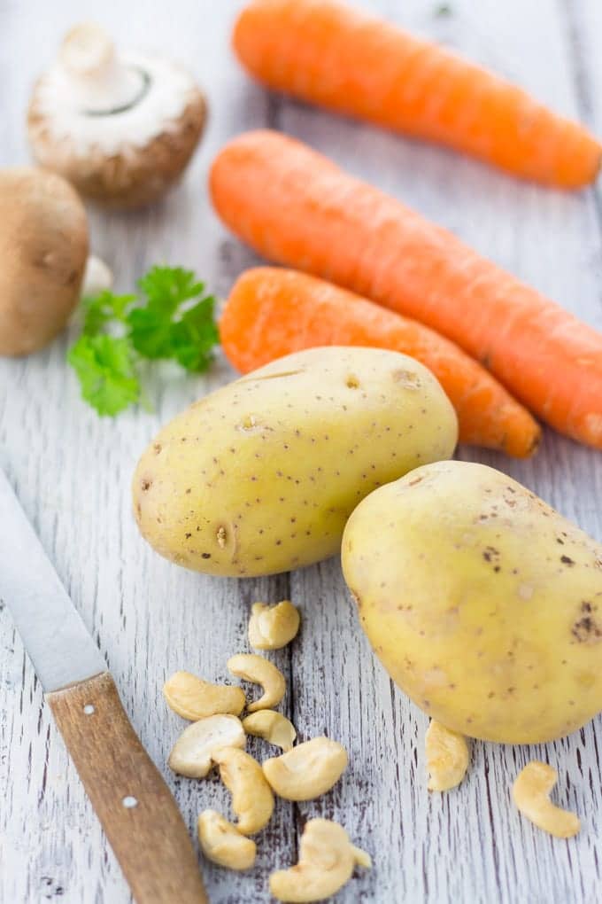 All you have to do is cut the potatoes and carrots into small pieces, cook them in salt water, and blend them together with the soaked cashews, nutritional yeast, and garlic. It really couldn’t be any easier!