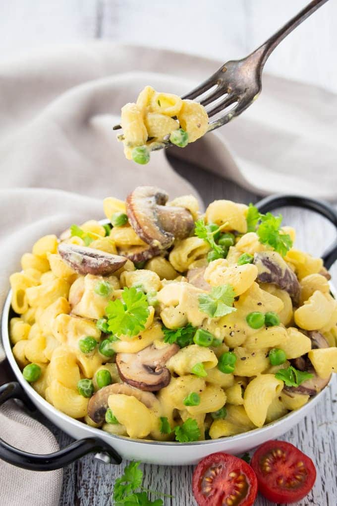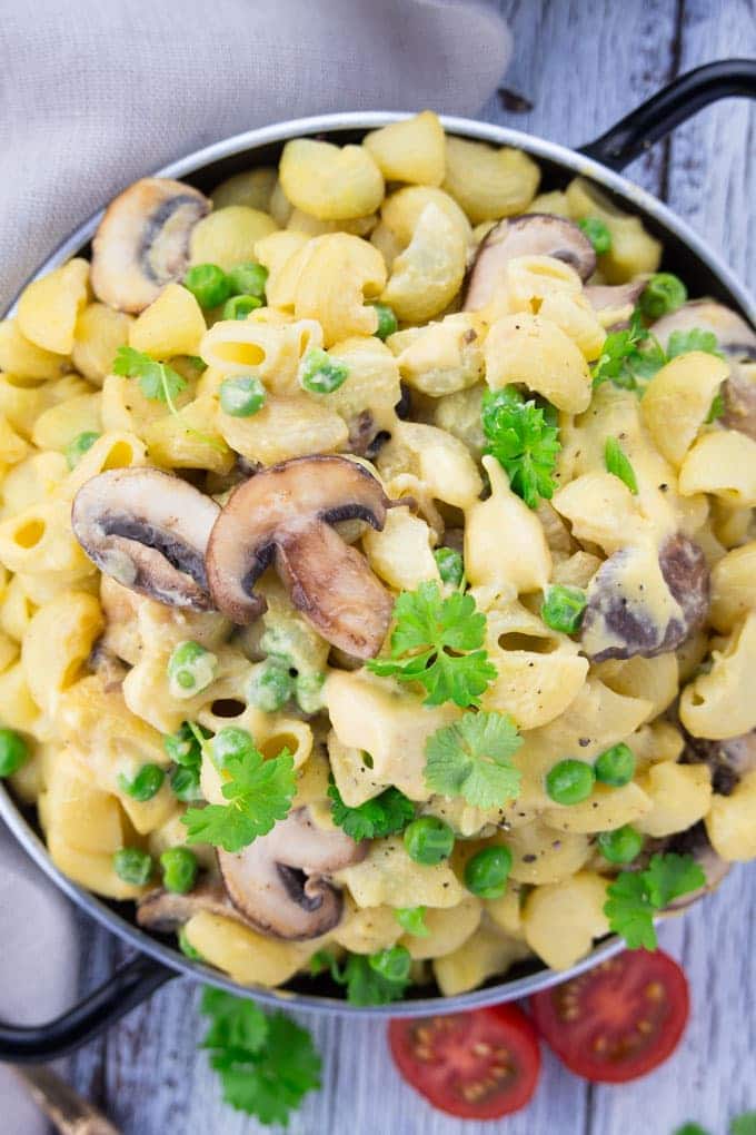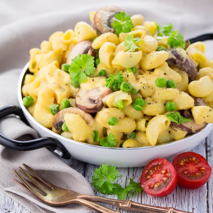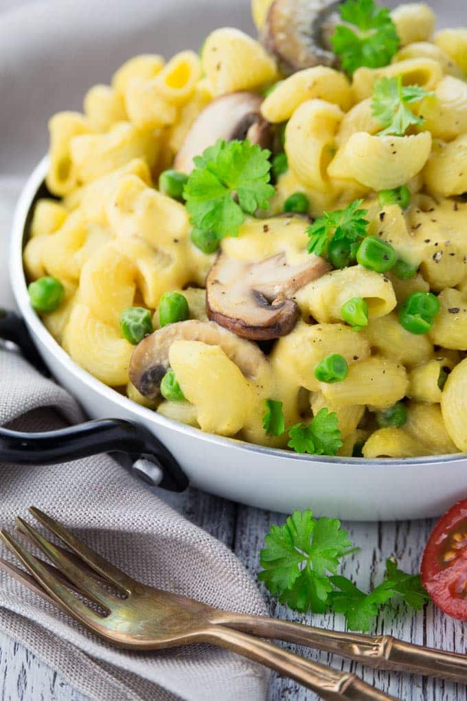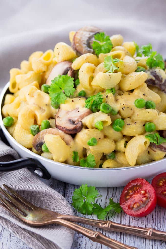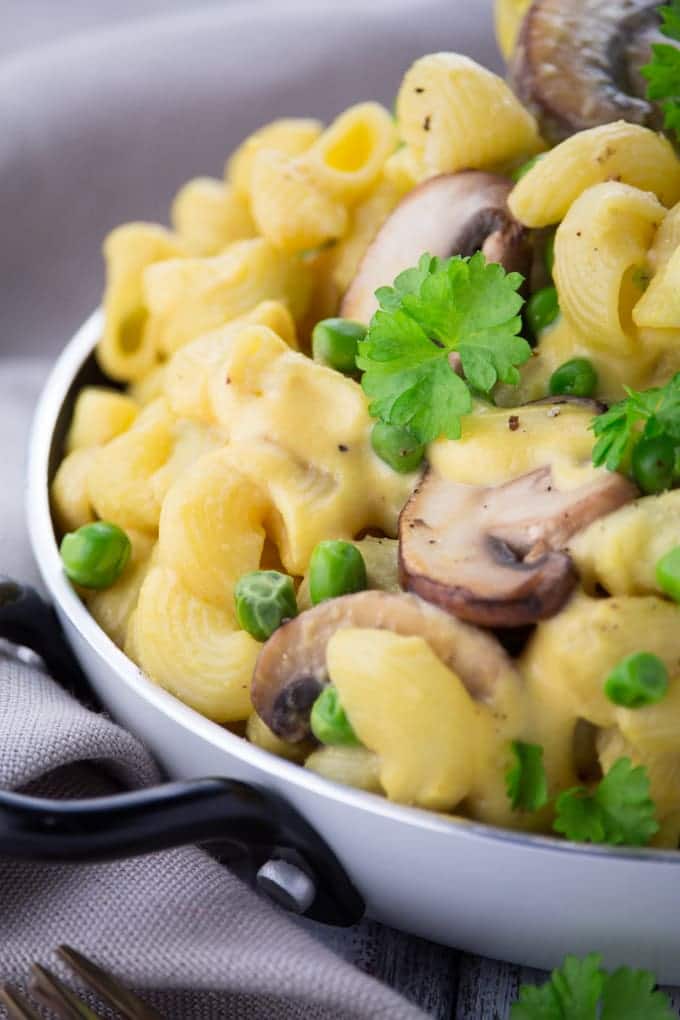 They’re super creamy, packed with flavor, oil-free, and just sooo good! Plus it’s so much healthier than classic mac and cheese recipes as it’s loaded with fresh veggies! If you don’t like mushrooms or peas or need something else for a change it’s also great with broccoli.