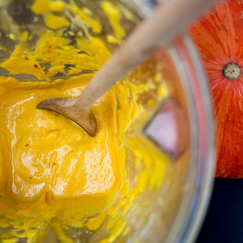 - Drain both the butternut squash and the cashews and place them into a blender. Add the rest of the ingredients and blend until smooth.