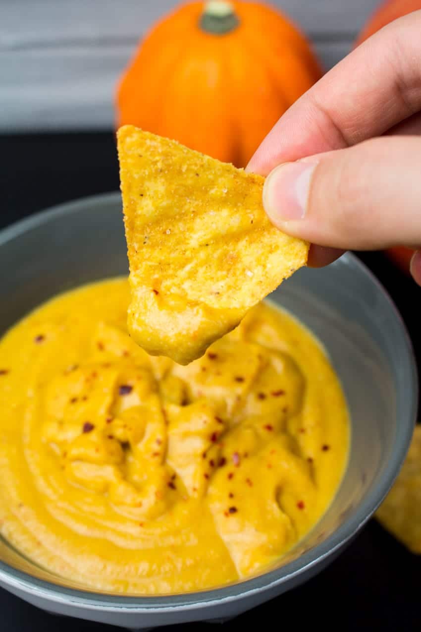 A lot of people told me that they could never go vegan because they’d miss cheese way too much and couldn’t live without it. I must admit that I was one of them until a couple of years ago. I was totally happy with vegetarian food, but no cheese?! This sounded kinda crazy to me. I mean how could you live without cheese sandwiches, cheese pizza, and creamy pasta? Well, now I know giving up cheese doesn’t mean you have to miss out on all those delicious flavors. There are so many yummy vegan cheese recipes that are even so much better and healthier than the real thing. Just the other night, we had these vegan nachos with pumpkin queso dip. As a real pumpkin addict, I try using pumpkin in everything these days and it also worked out reeeeeally great in this vegan cheese sauce. It’s super creamy, cheesy (haha! that’s what a cheese sauce is supposed to be, right?), and a little bit spicy.