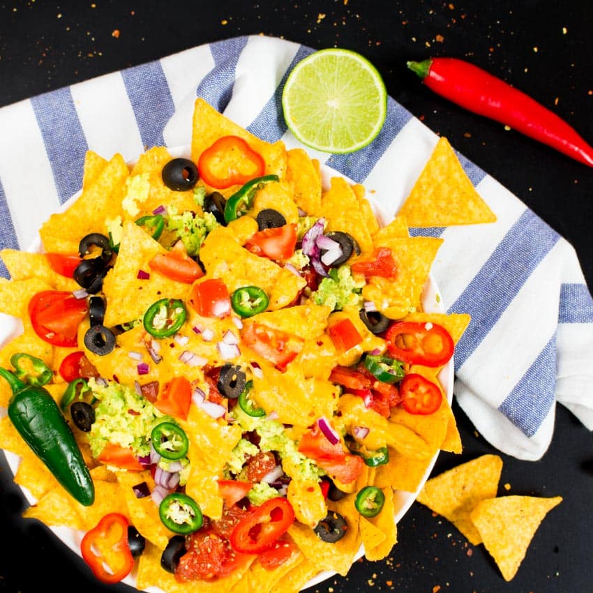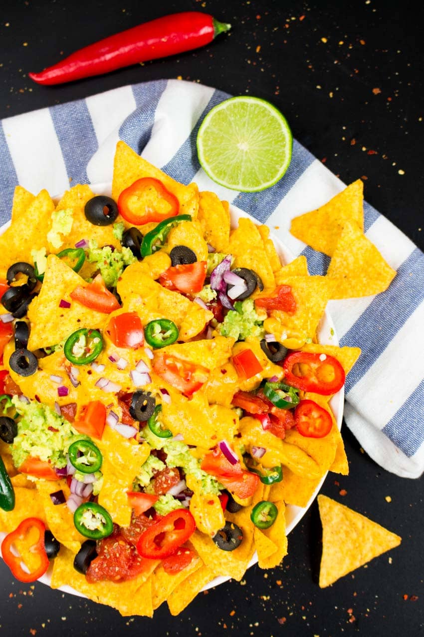 Besides the jalapeños, I also added black olives, tomatoes, red onions, red bell pepper, tomato salsa, and of course guacamole. These homemade vegan nachos with pumpkin queso dip are perfect for lazy movie nights. Just snuggle up on the couch, turn on a great movie or even better one of your favorite TV series (I’m totally into The Big Bang Theory right now), and have a bowl of these delicious nachos. Or invite some friends over and share this vegan deliciousness. ;-)