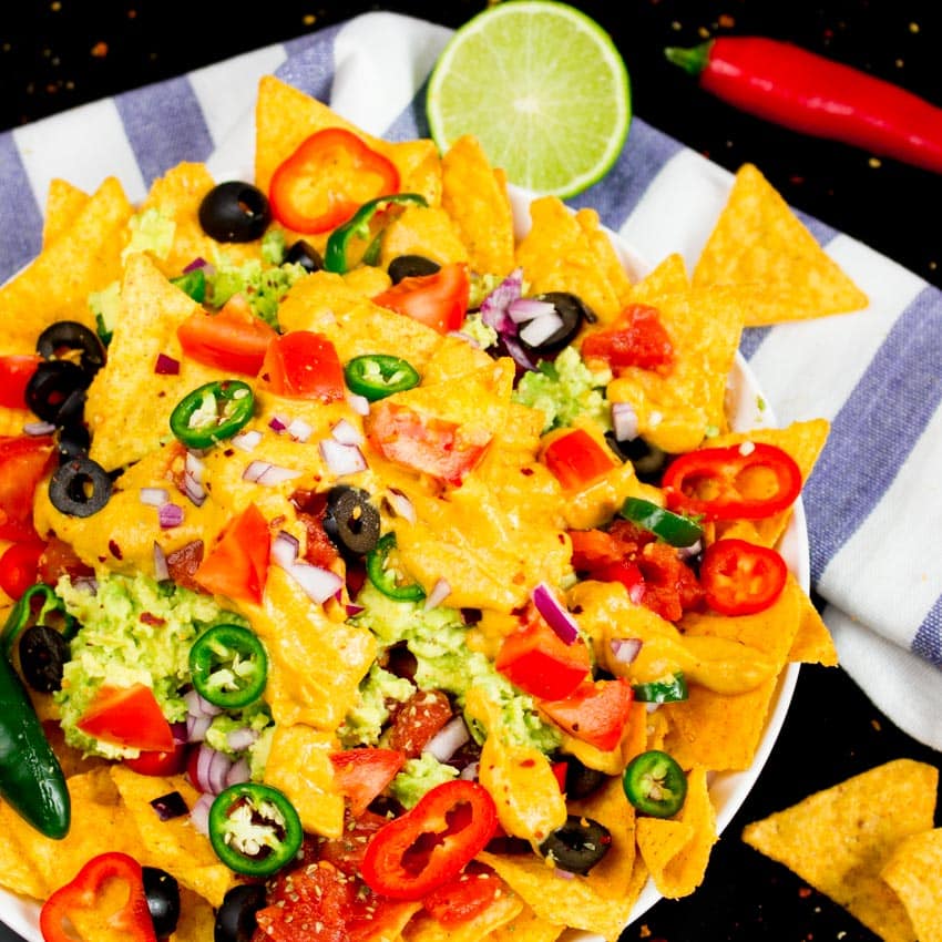 - Place the nachos into a big bowl and add the jalapeños, red onion, red pointed pepper, black olives, guacamole, tomato salsa, and tomatoes. In a small pan, heat the vegan pumpkin cheese sauce until it becomes really thick and creamy.