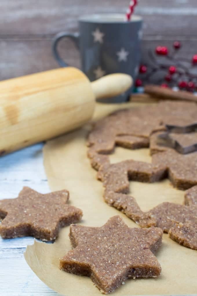 - On a floured board or baking parchment, roll out the dough to about 0.4 inch (1 cm) thickness and cut it into star shapes using a cookie cutter.