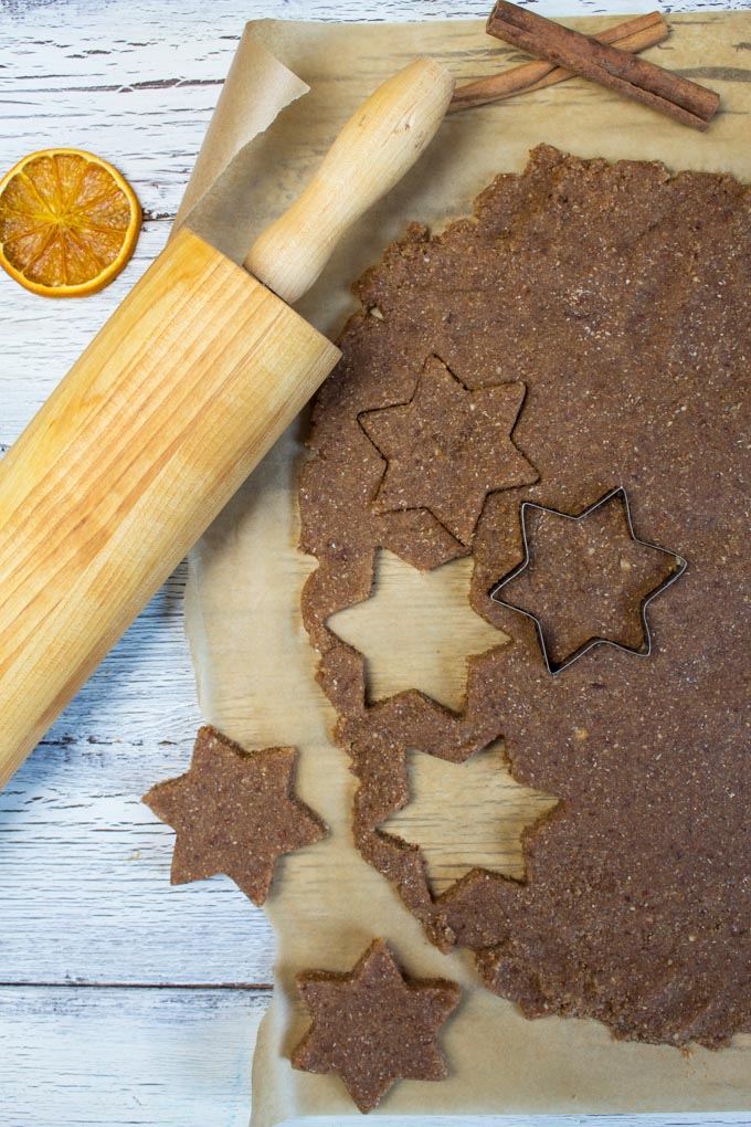 For the vegan orange cinnamon Christmas cookies you only need 7 ingredients: Powdered brown sugar, almonds, hazelnuts, orange juice, cinnamon, water, and flour. Sounds easy? It really is!