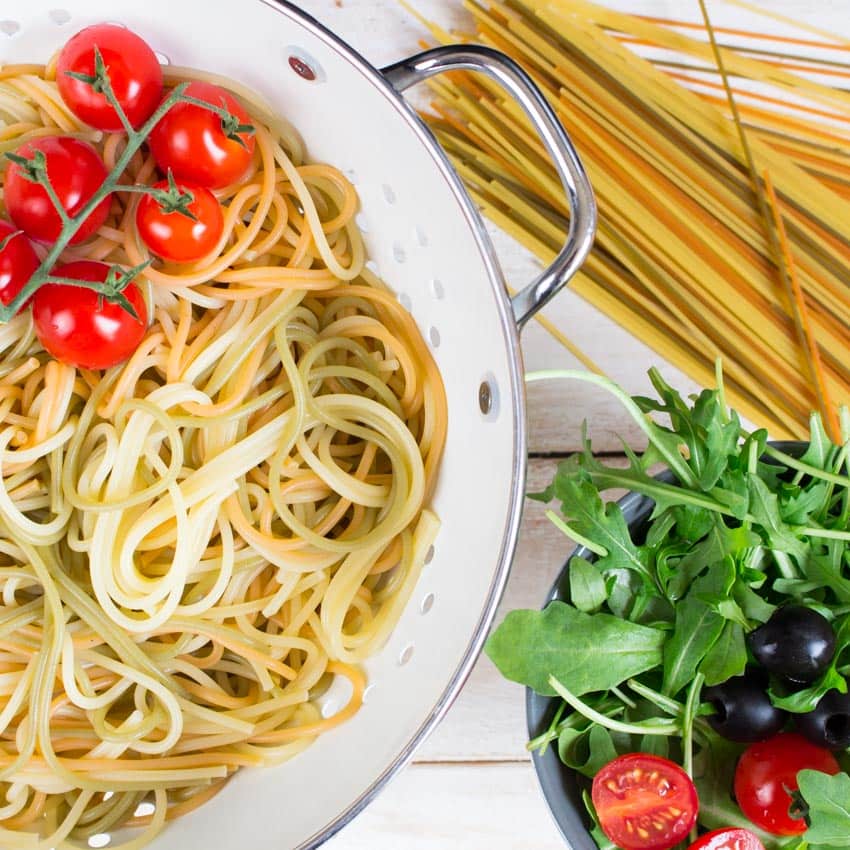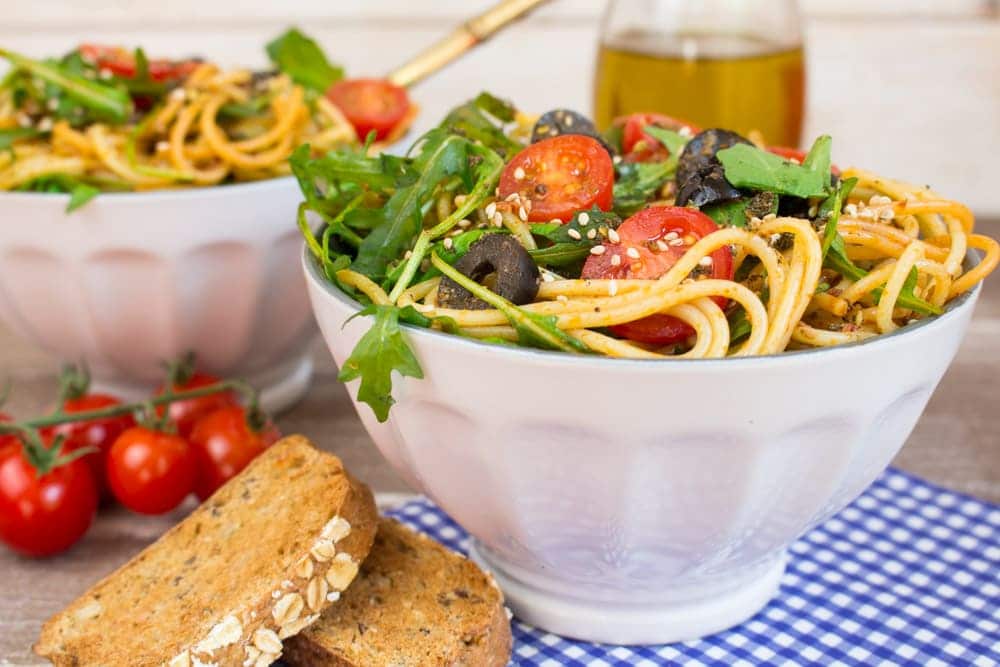 But back to the spaghetti salad. If you don’t like arugula (I know some people don’t, I also just recently began to love it), you can also sub it with fresh baby spinach. Instead of the sun-dried tomato and caper spread that I got from GlobeIn, you can also use homemade pesto. I included a recipe for sun-dried tomato caper pesto further down in the recipe section. Of course you can also serve the cold pesto pasta salad warm and top it off with fresh arugula.