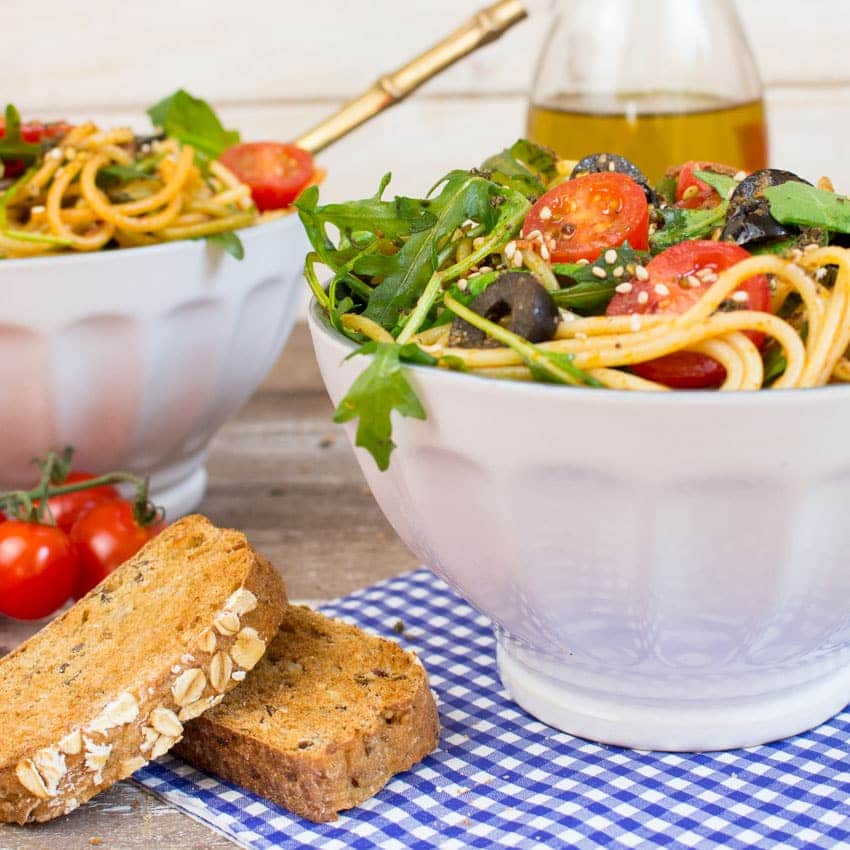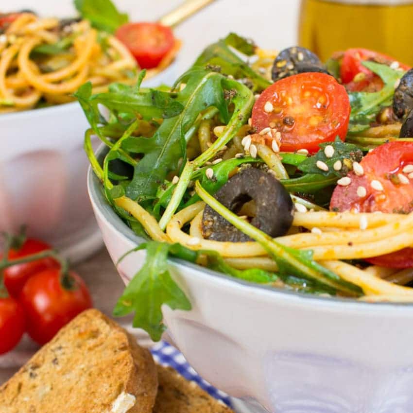 I’ve always loved pasta and I really don’t know what I like better: warm pasta dishes or pasta salad. I think the special thing about pasta salad is that we don’t have it very often (most of the time we only make it for parties or BBQs), so I’m always getting quite excited about it. When GlobeIn sent me one of their Artisan boxes to review and it contained a jar of sun-dried tomato caper spread and a box of thyme with roasted sesame seeds, I knew right away that this would make a perfect vegan pesto pasta salad. I also added arugula, cherry tomatoes, and black olives. To give the pesto salad a bit more color, I used tri-color spaghetti, but of course you can also use regular or whole-wheat spaghetti. It’s already getting colder here, so we only enjoyed the salad together with roasted bread, but it would also be a great side dish for BBQs and picnics. It’s super easy to make and comes together in only 20 minutes.
