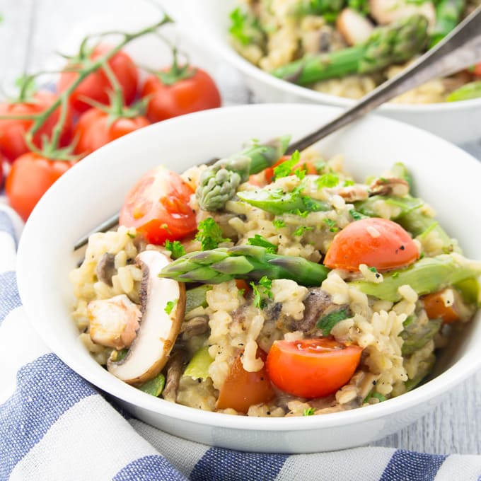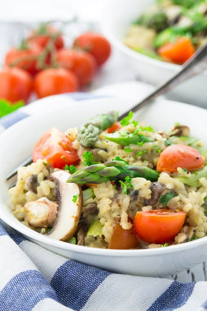I’m so happy it’s asparagus season again! And it pairs so well with mushrooms. This creamy risotto looks so delicious!! The perfect spring meal!