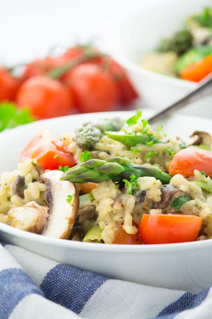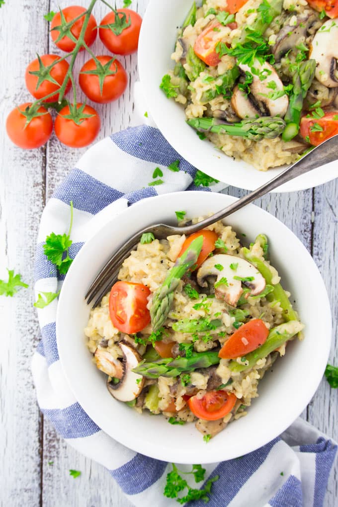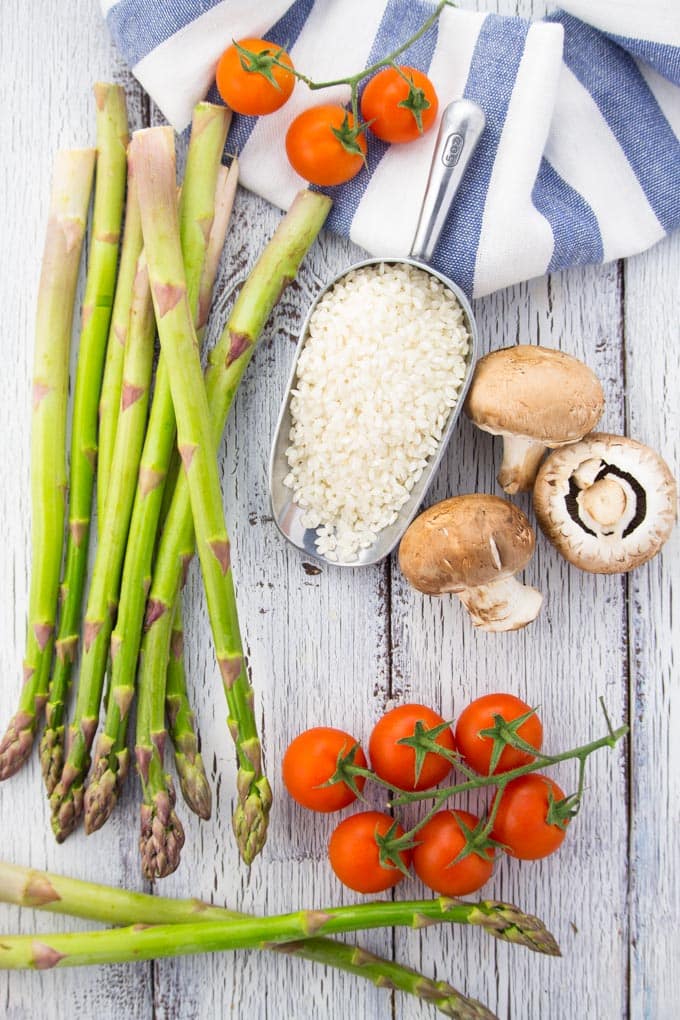 The best thing is that this spring risotto is super easy to make. All you need is risotto rice, green asparagus, mushrooms, cherry tomatoes, garlic, an onion, white wine, miso paste, and nutritional yeast. Oh and of course, salt and pepper.