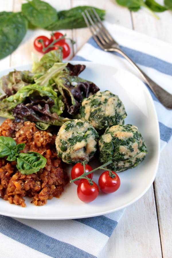 I automatically connect bread dumplings with happy childhood memories. Whenever my grandma asked what I’d like to eat when I stayed at my grandparent’s house, I chose bread dumplings with mushroom gravy, a typical German comfort food. They have always been vegetarian, but my grandma uses eggs to bind the ingredients together. It’s, however, not really necessary and Flo and I had some delicious vegan spinach-bread dumplings with lentils the other day.