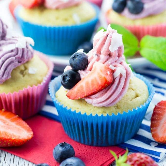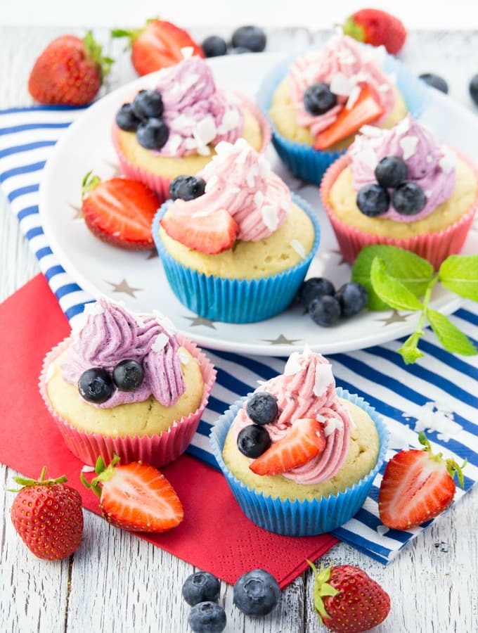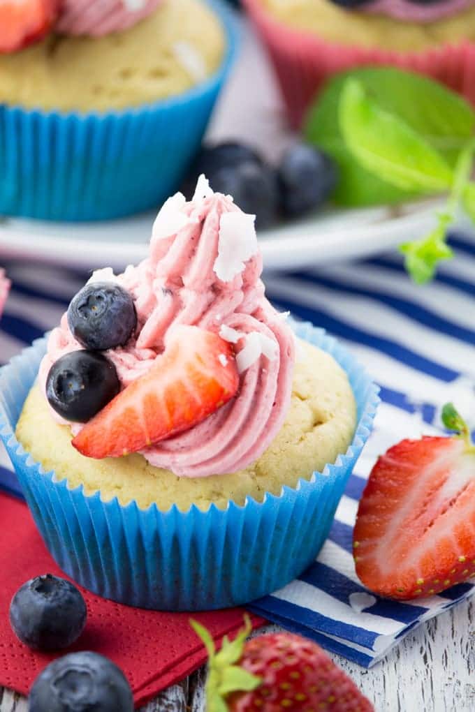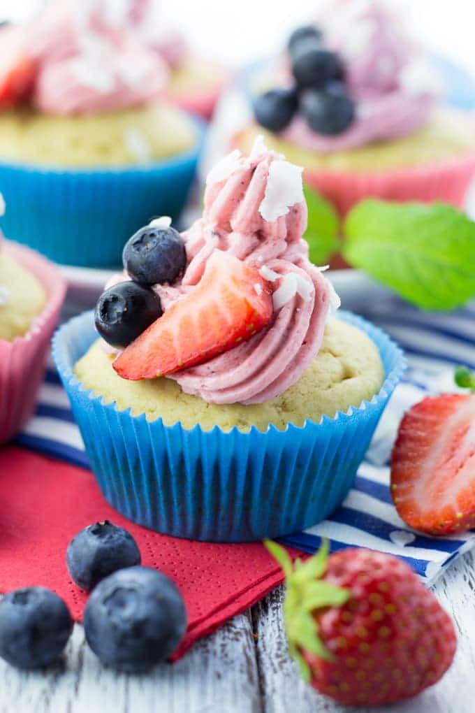 - Decorate the cupcakes with strawberries, blueberries, and coconut flakes. Serve immediately or store them in the fridge.