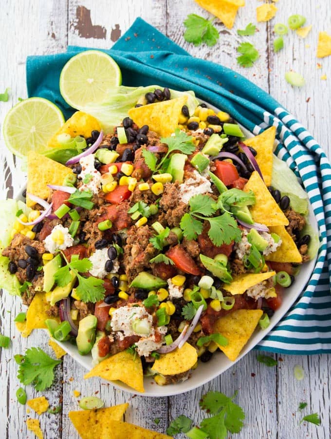 - In a large bowl, combine the lettuce, the corn, the tomato, the avocado, the salsa, and the black beans. Serve with the lentil walnut meat, cashew sour cream, and the nachos on top and sprinkle with green onions, red onions, and fresh cilantro.