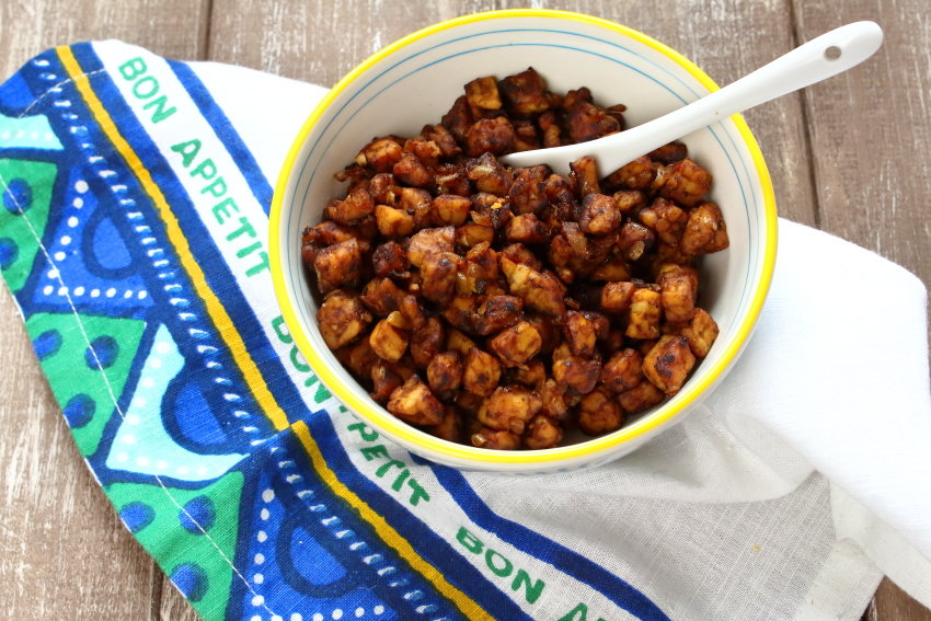 - Cut the tempeh into little cubes. In a medium pan, heat the olive oil over medium heat. Stir-fry the tempeh for about two minutes. Then add the chopped onions. Cook for another two minutes. Add the BBQ and soy sauce as well as the spices and cook for about 5 minutes until the tempeh is brown and crispy.