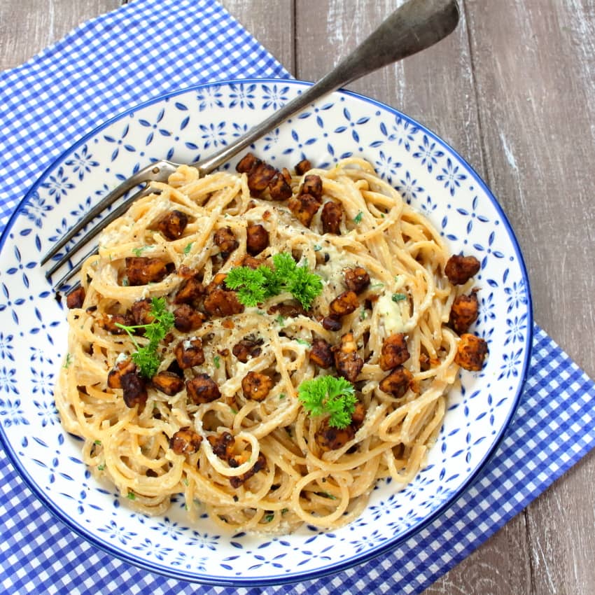 Vegan carbonara sauce was actually one of the first dishes I tried when I decided to stick to a vegan diet. At this time, I still used soy cuisine for the sauce. Now, I usually rely on cashews and plant-based milk to make creamy sauces. Nutritional yeast and miso paste gives the vegan carbonara sauce its typical cheesy flavor. If you like you can also add peas, broccoli, or mushrooms to your sauce. The vegan tempeh carbonara sauce goes well with a green side salad.